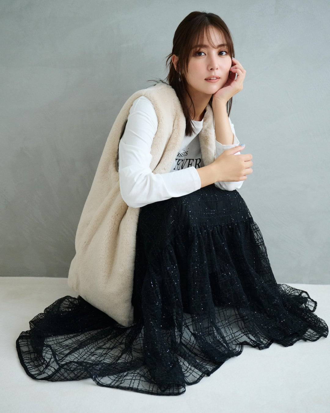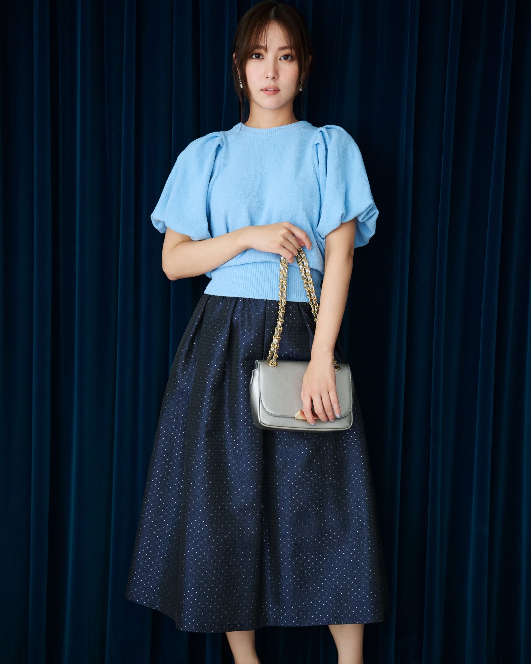 2. キャッチーなボリュームスリーブニットに ラメドットのスカートで品よくドレスアップ