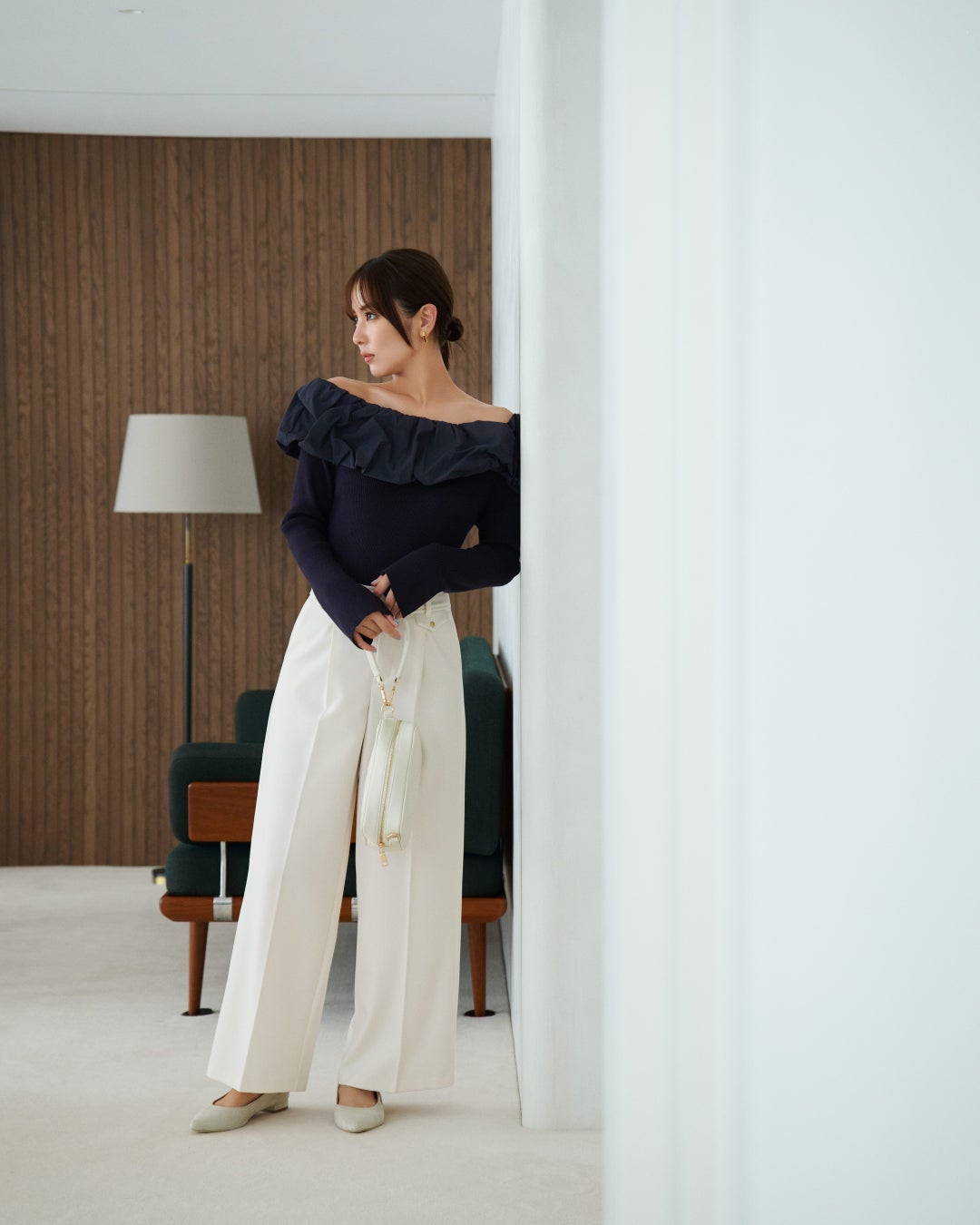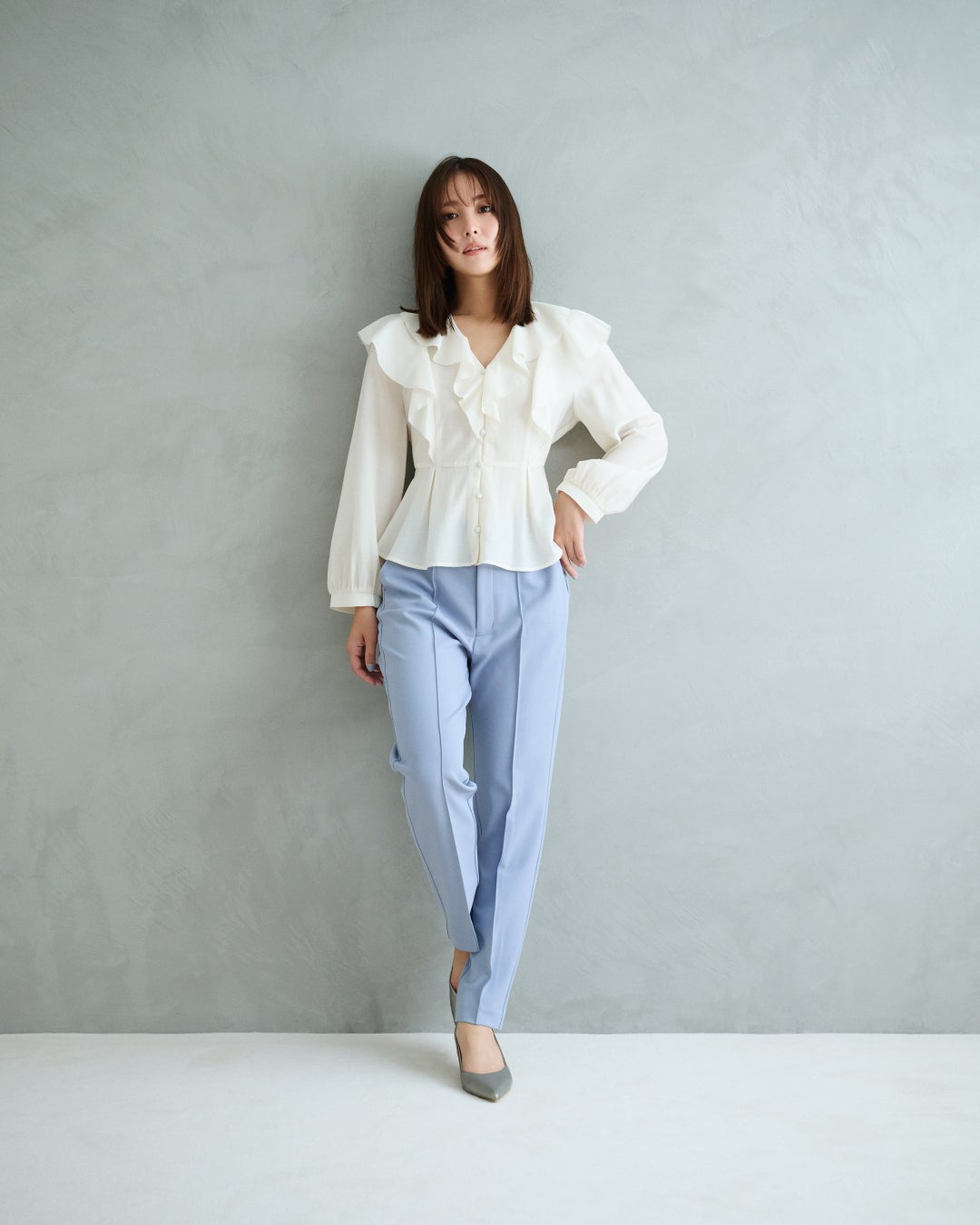 4. ラッフルデザインが目を引くペプラムブラウスは、すっきりシルエットのパンツ合わせで引き算を