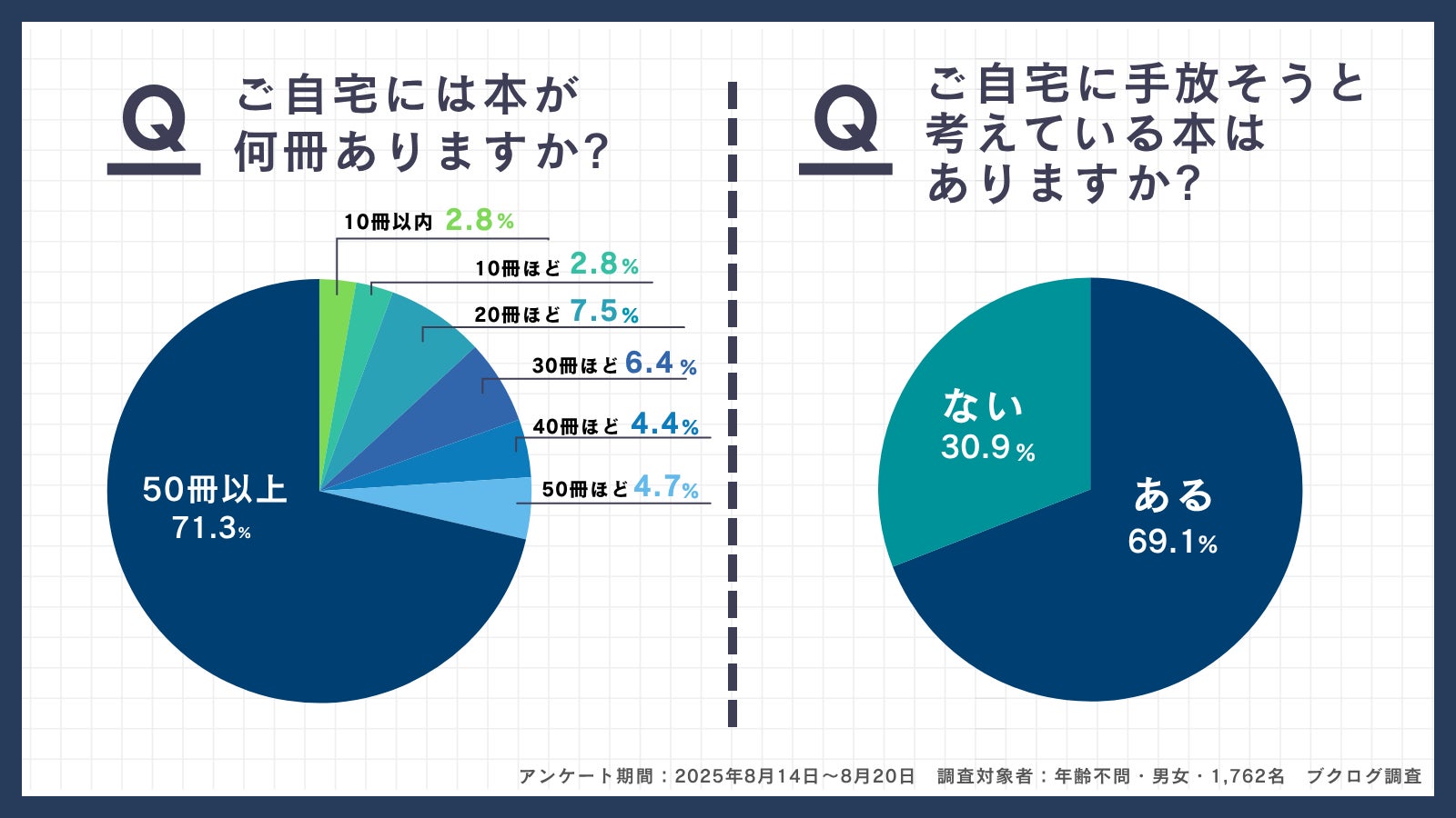 ② 回答者の多くがご自宅に50冊以上の本を保管しているが、再読しないことや、本棚にスペースがないことなどから、約70%の方がご自宅にある本を手放したいと考えている。