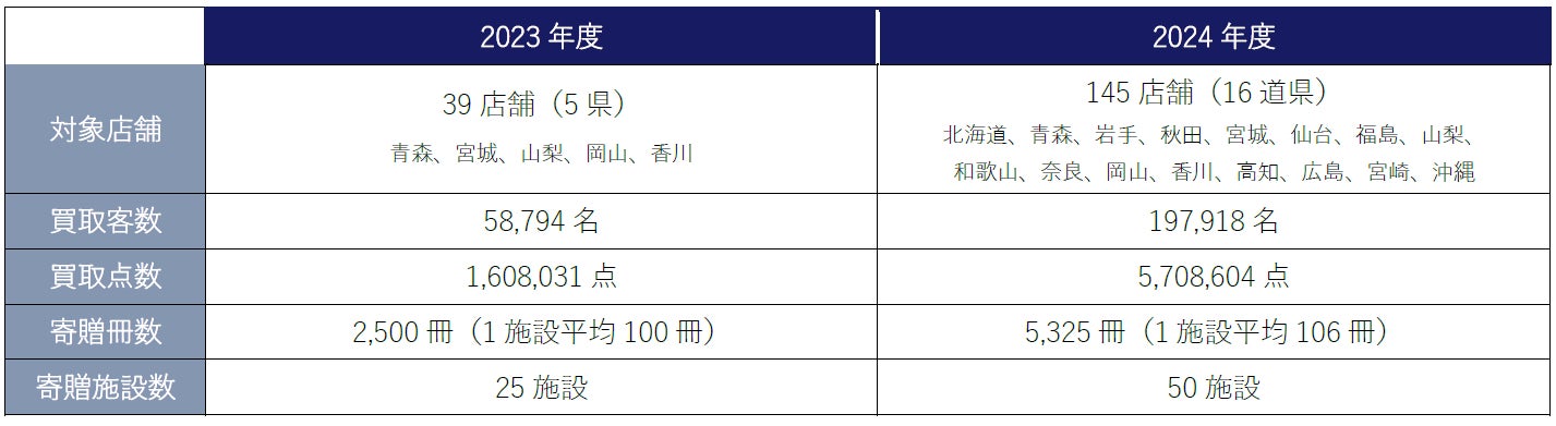 「サステナブックプロジェクト」では、子どもの読書機会創出、地域の読書機会格差解消を目的とし、本を必要としているのに十分に集められない非営利団体運営の児童施設、学校などの教育機関、図書施設へ中古本を寄贈いたします。2025年の対象地域となるのは、図書館設置率が全国平均以下の地域をベースとした25道府県。期間中、対象店舗においてお客さまから買取した本10点につき1円分と換算した寄付額を算出し、該当金額に相当する中古本を寄贈いたします。