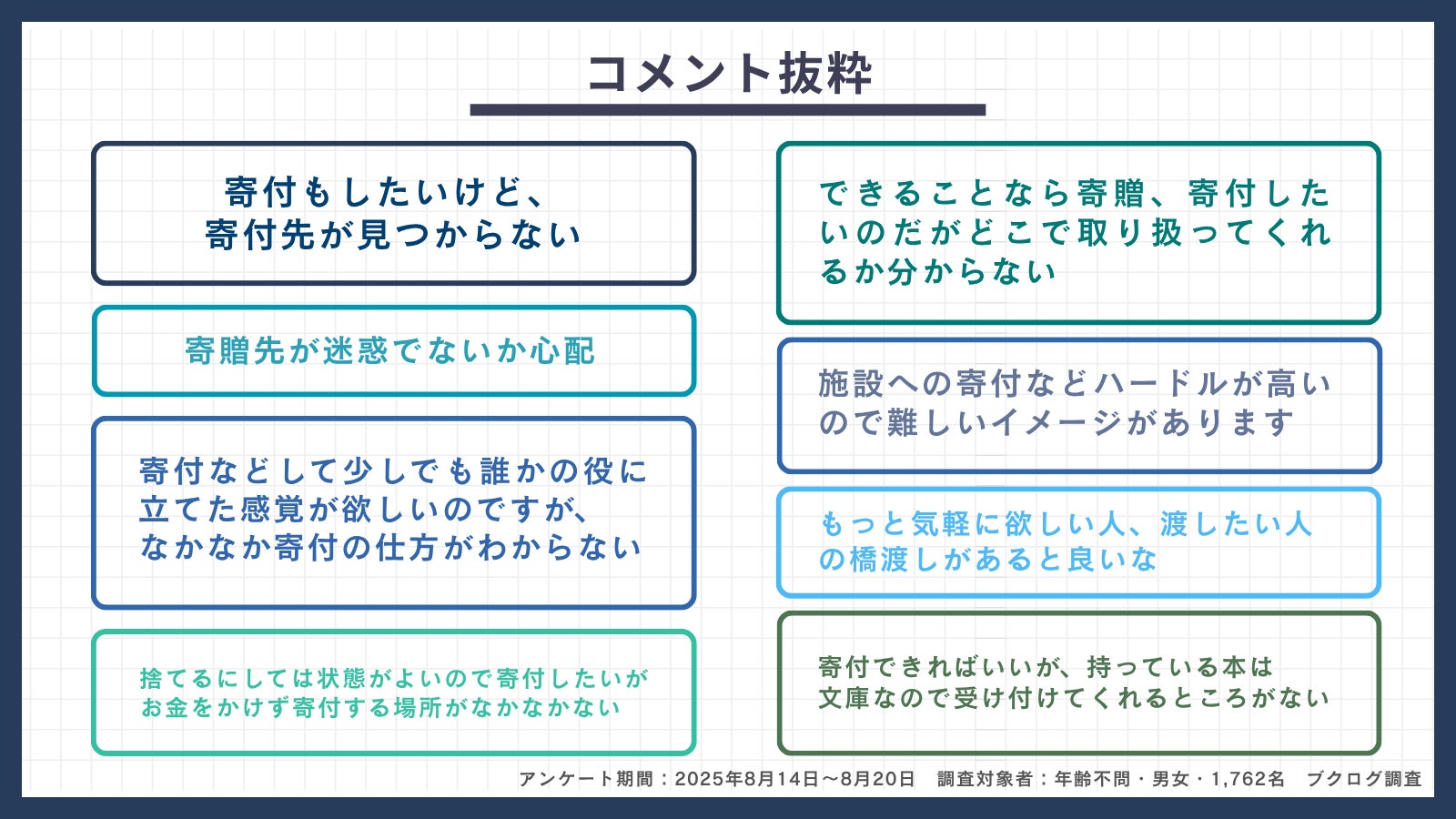 「購入した本は読み終わった後どうしていますか?」の質問に対し約8%の方が「寄付する」と回答しました。読書好きの方は少しでも読んでくれる方の手に渡ってほしいという想いがある一方、「寄付先や方法がわからない」「寄付先に迷惑なのではないか」「ハードルが高い」など、寄付・寄贈に関するお悩みも49件寄せられました。これらのお悩みに対し、ブックオフでは、寄付先や方法が明確かつ気軽に必要とする人への寄贈に参加できる機会を提供いたします。