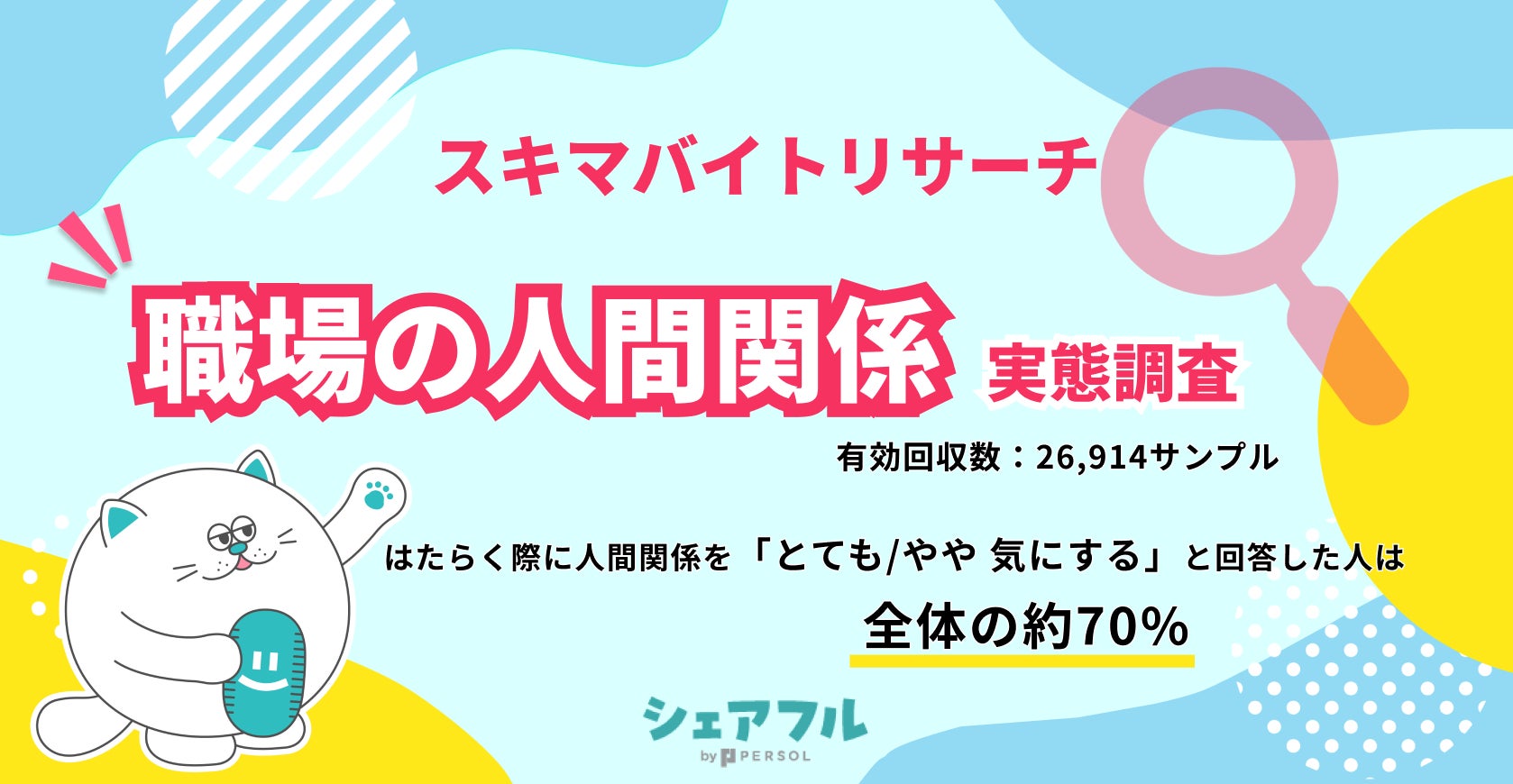 『シェアフル』アプリをインストールしているユーザーを対象に、アプリ内機能「シェアフルmembers」を使用したアンケートを実施しました。「職場の人間関係」に関するアンケートを取った結果、26,914件の回答がありました。