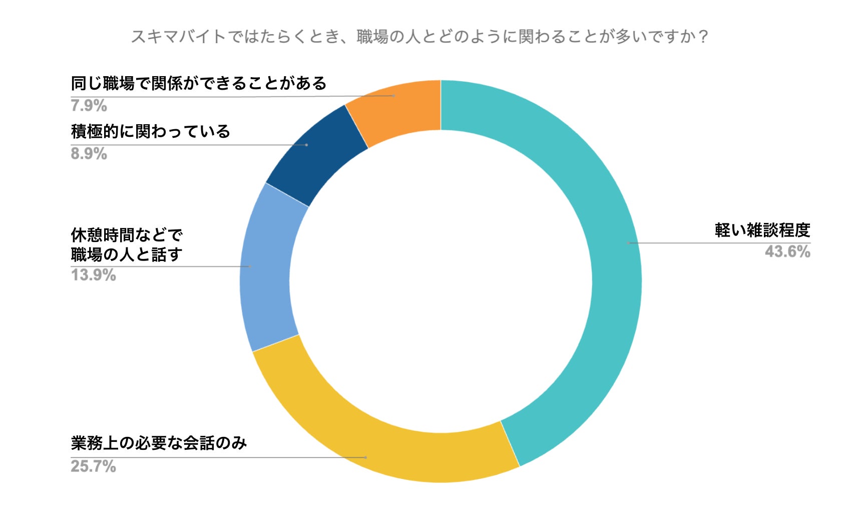 スキマバイトではたらくとき、職場の人とどのように関わることが多いですか?という質問に対し、最も多かったのは「軽い雑談程度」で43.6%、時点で多かったのは「業務上必要な会話のみ」で25.7%だった。「職場の人積極的に関わっている」、「同じ職場で関係ができることがある」などコミュニケーションを多くとっている方は、約17%だった。