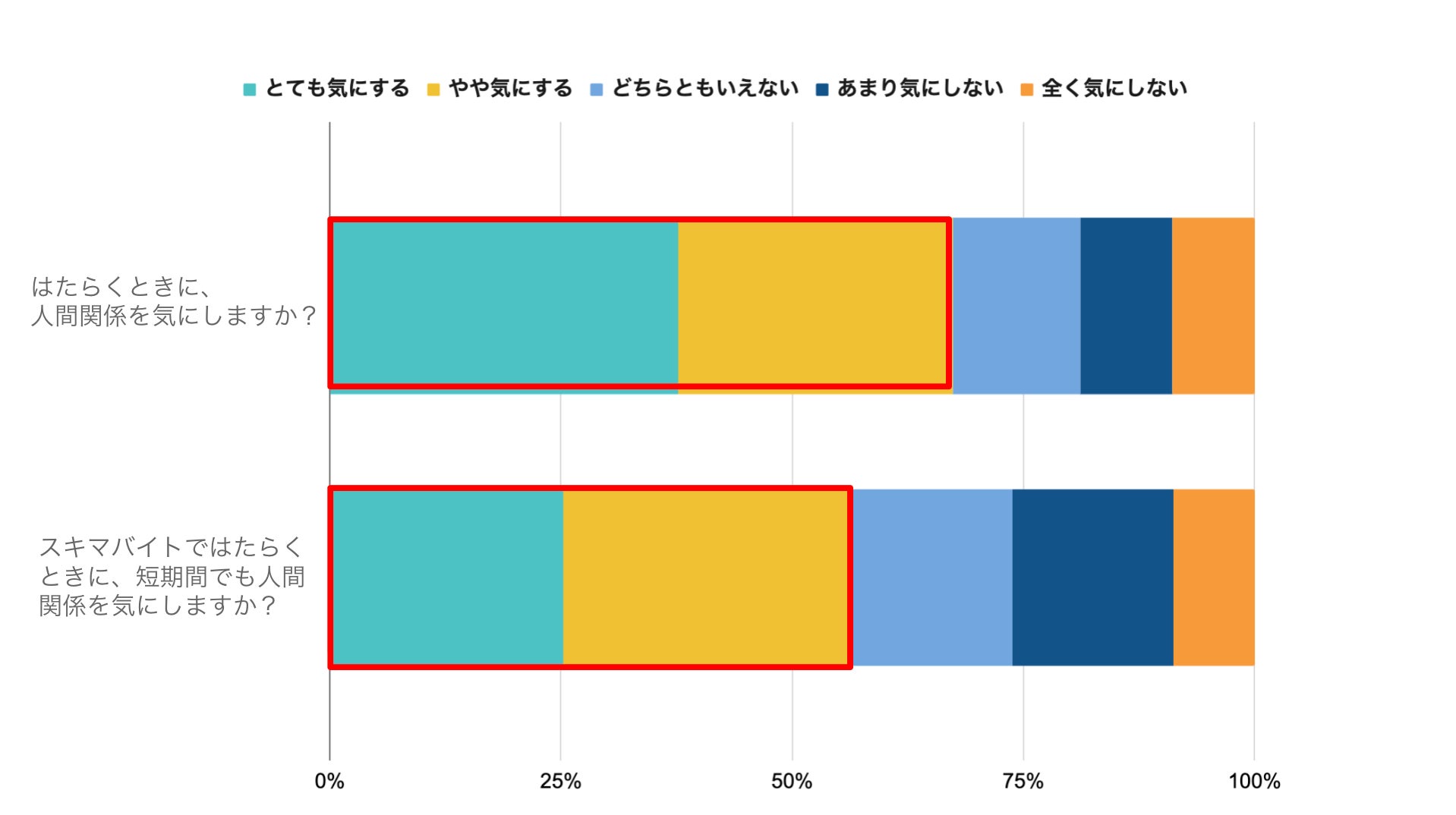 一方で、スキマバイトに限った場合はその割合が58%にとどまり主に「とても気にする」と回答した人が10%減少した。