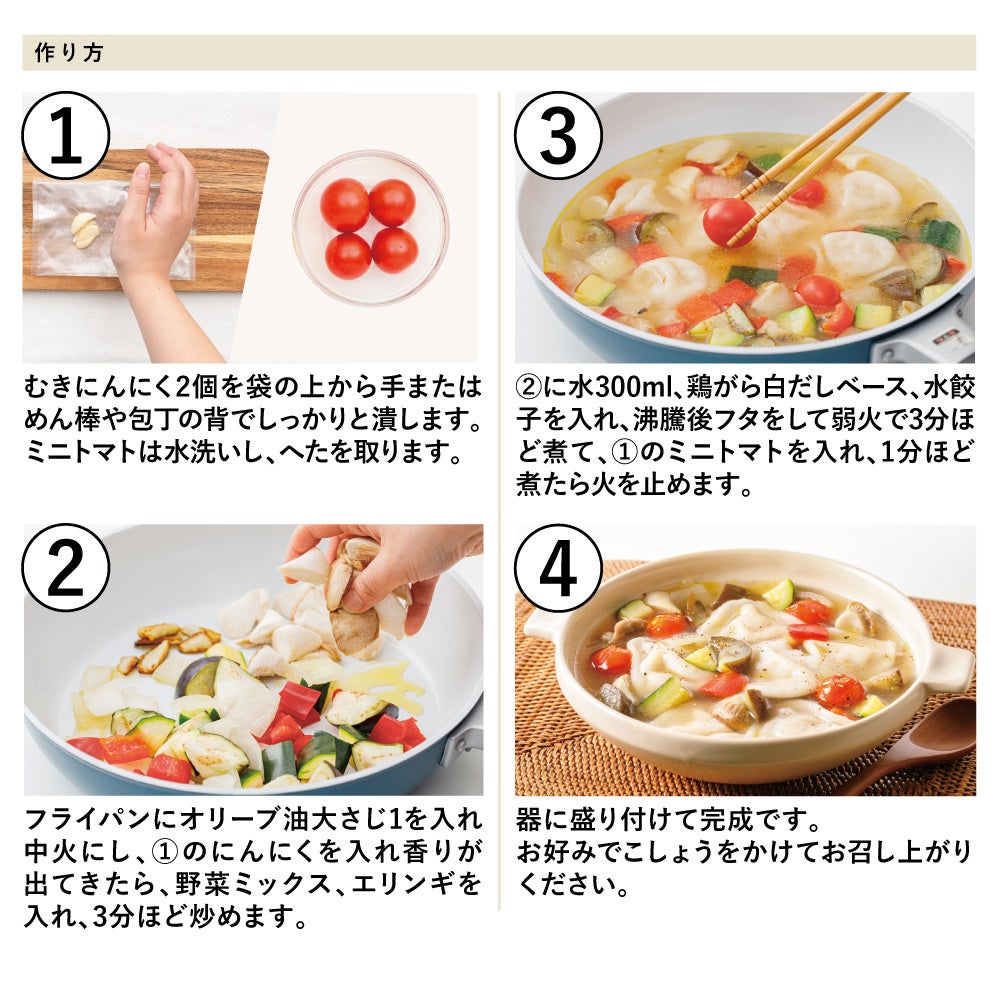 ◆7種野菜とぷるもち水餃子の旨だしスープ(2人前 調理時間 10分)