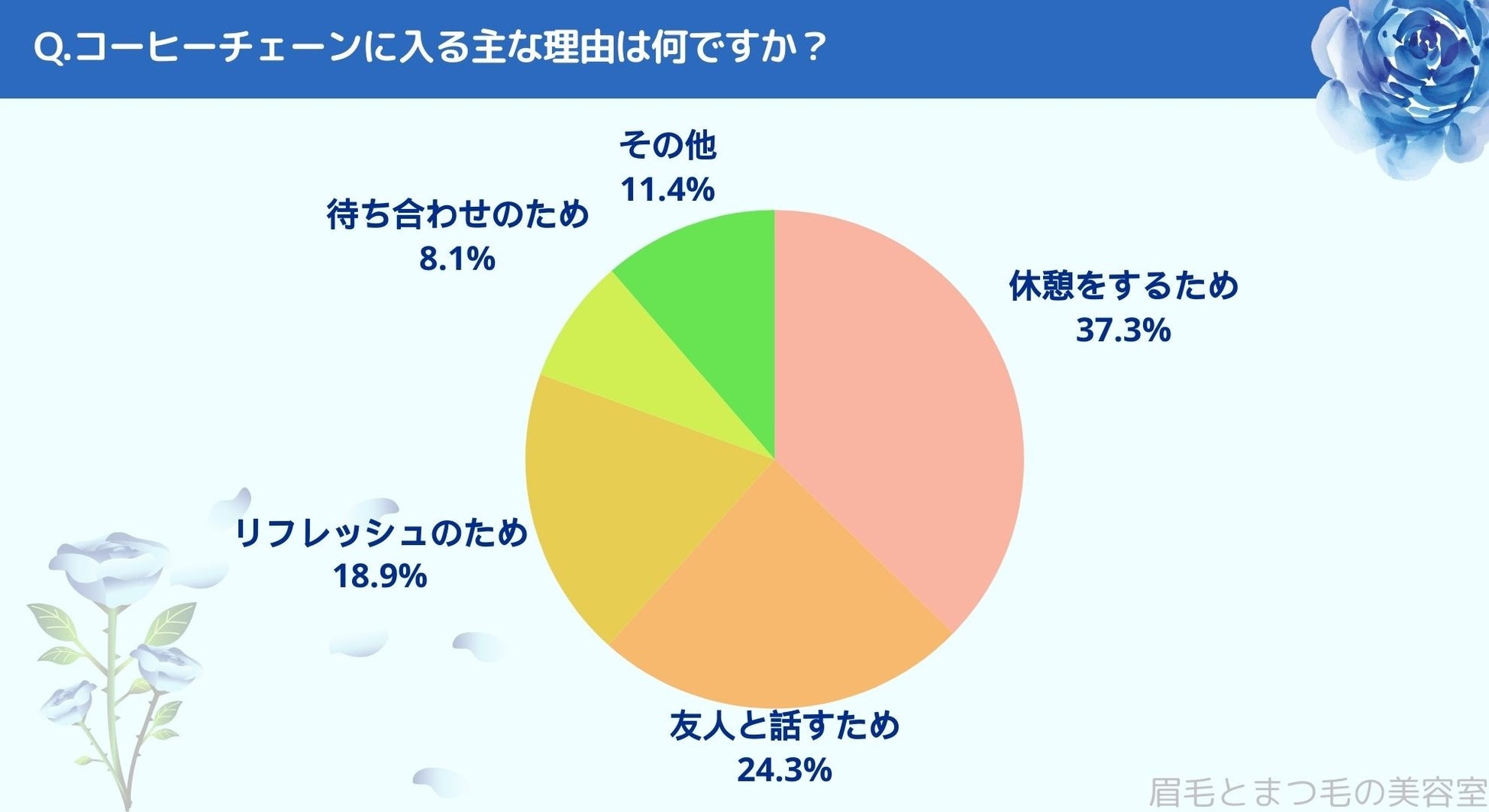 コーヒーチェーンに入る理由をお聞きしたところ「休憩をするため(37.3%)」、「友人と話すため(24.3%)」、「リフレッシュのため(18.9%)」、「待ち合わせのため(8.1%)」、その他(11.4%)」という結果になりました。