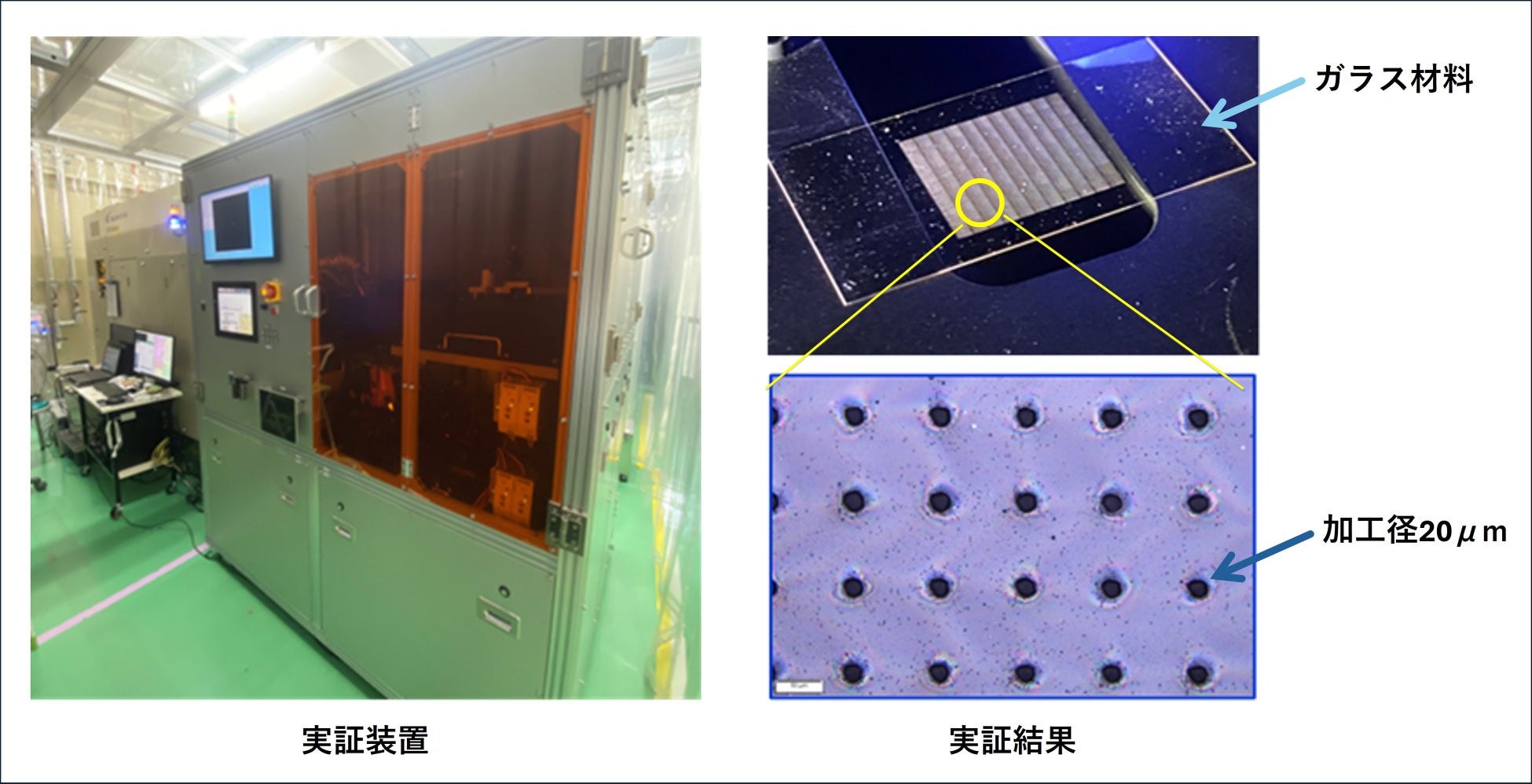 本実証装置での確認により、高生産性微細加工技術の開発での成果を装置レベルで実証することができ、同時にこれまで問題であったガラス材料への微細穴加工、加工生産性を解決できることを実証しました。