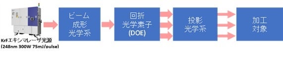 KrFエキシマレーザと深紫外域DOEを組み合わせることにより、高効率マスクレス同時多点加工方式(図2)を実現し、難加工材における高生産性微細加工技術を開発しました。具体的には、〔1〕DOEを用いた深紫外域同時多点加工光学系の開発、〔2〕高ビーム品位KrFエキシマレーザ光源の開発、〔3〕アブレーション学理研究による難加工材微細穴の高生産性照射プロセス開発を実施しました。