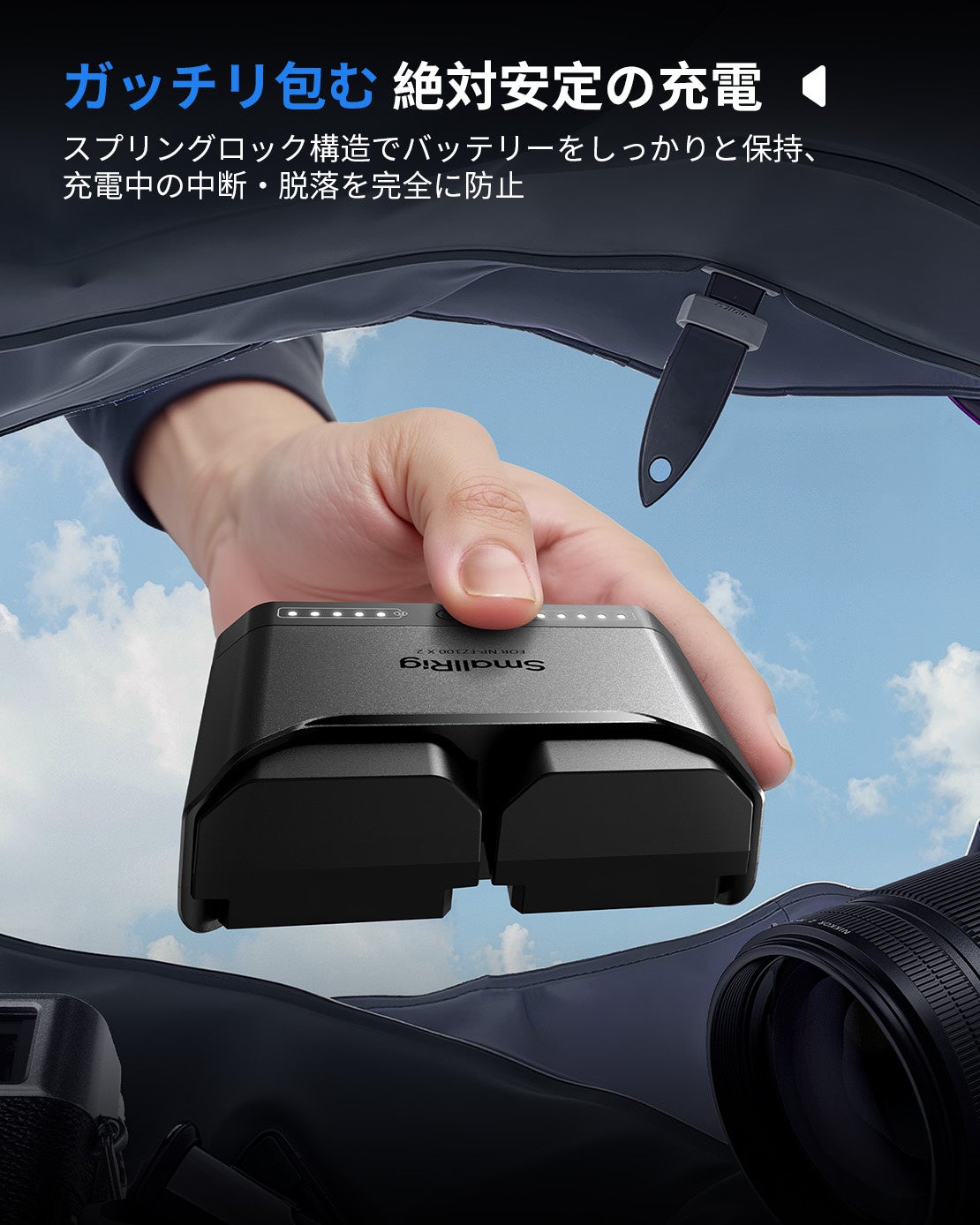 手のひらサイズで携帯性抜群。スプリングロック構造で充電中もバッテリーをしっかり保持します。