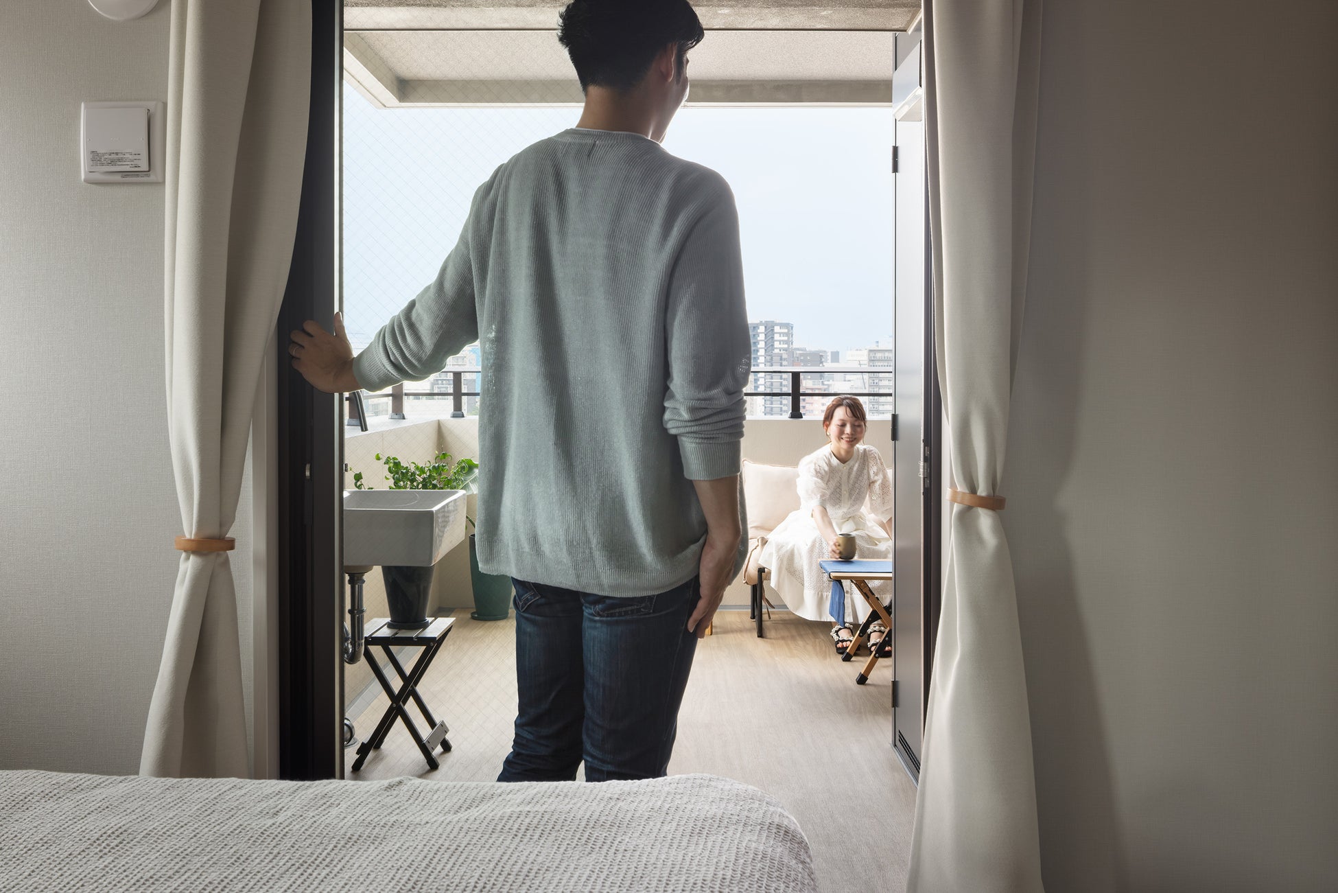 名古屋市営地下鉄東山線・鶴舞線「伏見」駅徒歩7分、仲ノ町公園に隣接する開放的な土地に、1フロア2邸、奥行4m、20㎡の広々としたプライベートポーチを持つ共同住宅「デュオヒルズ伏見」を計画しました。2方向に扉を持つエレベーターを中央に配置し、それぞれの住戸にのみアクセス可能とすることで、扉が開いた先にはプライベート空間が広がります。ポーチは玄関だけでなく居室からも行き来が可能なデザインとし、思い思いの過ごし方ができる専有面積以上の生活スペースを提供いたしました。