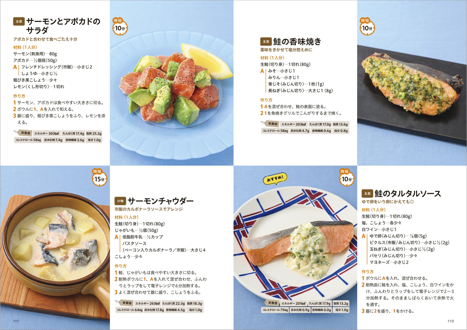 低脂質のおかずの中心は、魚介類になります。さば、鮭、かつお、まぐろ、えび、あさりなどを使ったおいしいレシピを紹介しています。また、卵、豆腐、鶏肉、豚肉を使った料理も掲載しています。どのレシピも、かんたんでおいしいものばかりです。