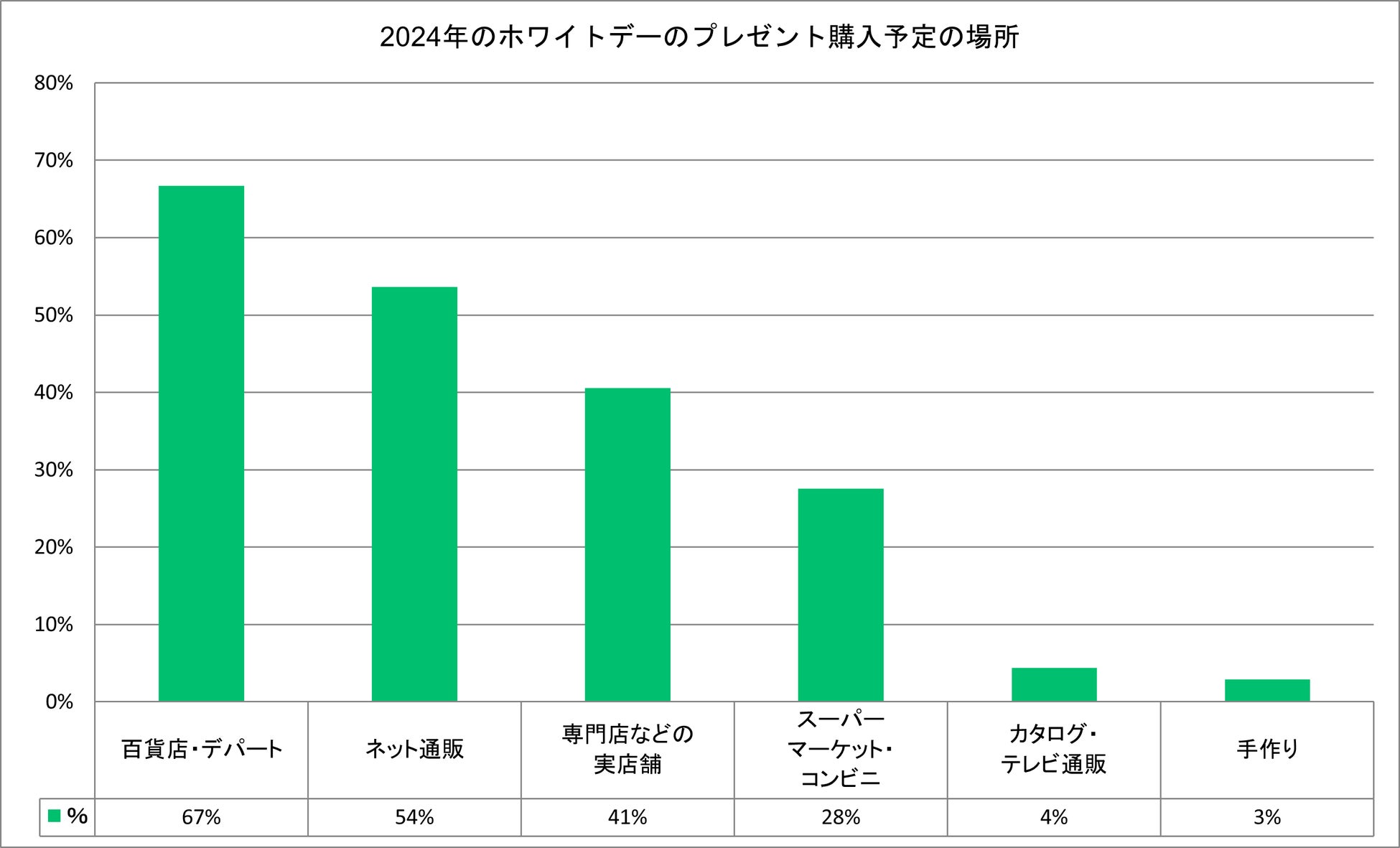 ホワイトデーのプレゼントの購入先の上位は、「百貨店やデパート」が67%、「ネット通販」が54%となりました。ネット通販選択理由としては、多種多様なラインナップや利便性があげられています。
