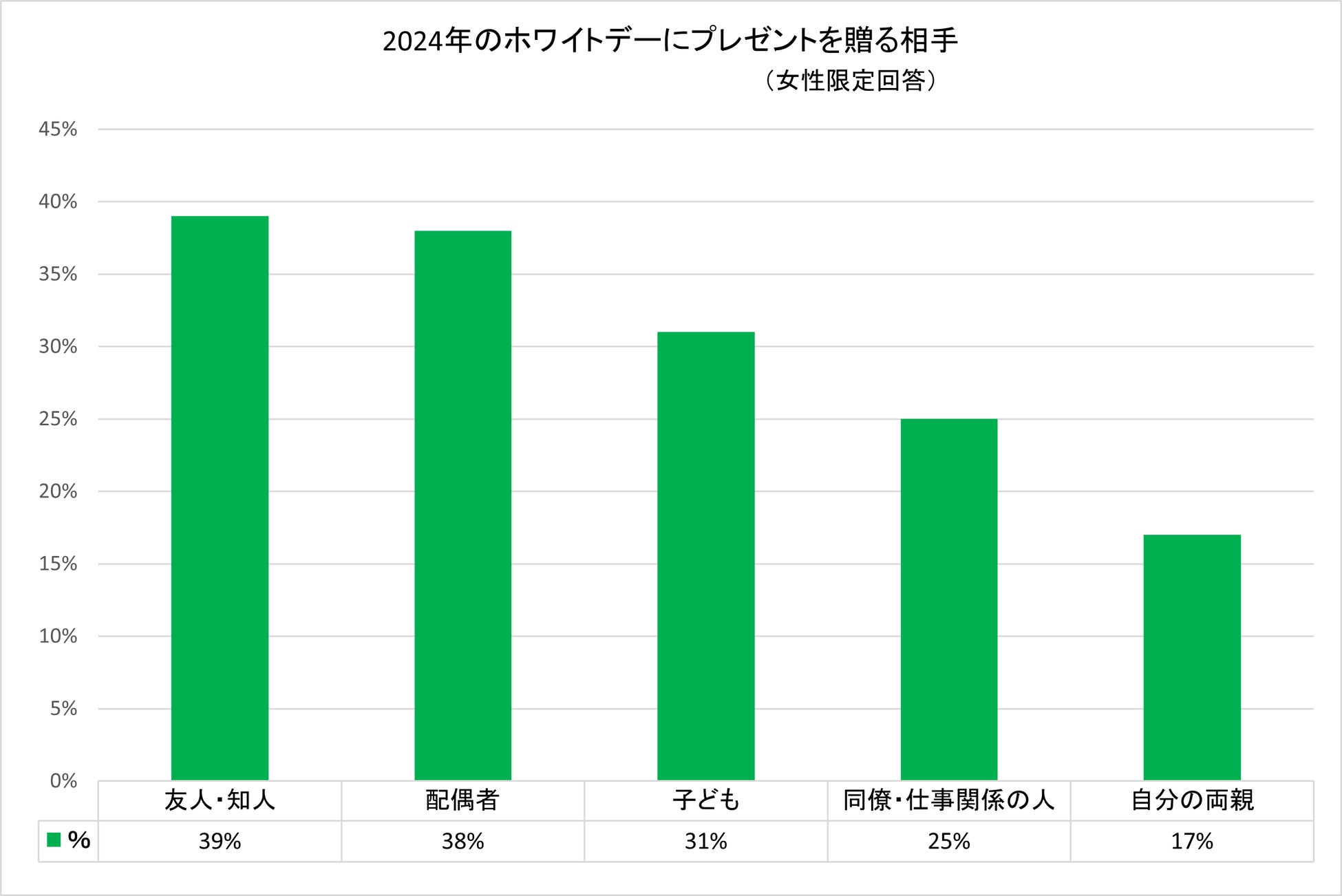 ・女性回答者を対象:ホワイトデーの贈り先「友人・知人(39%)」、「配偶者(38%)」
