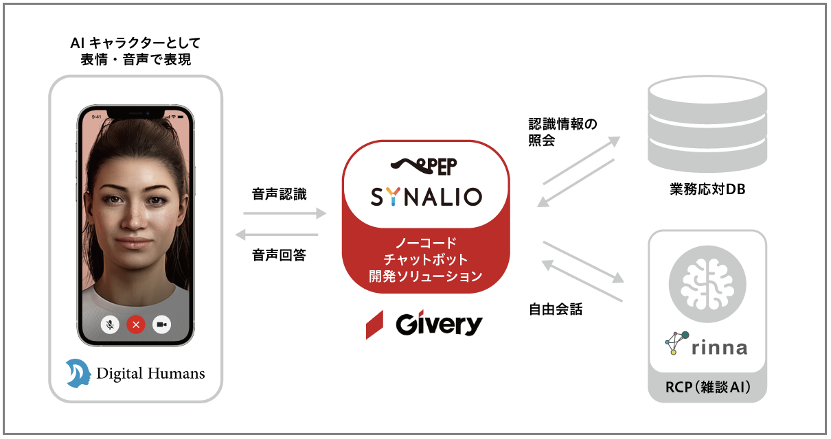 テクノロジーによって“デジタル化促進”に寄与する事業を展開する株式会社ギブリー(本社:東京都渋谷区、代表取締役社長:井手 高志、以下ギブリー)は、rinna株式会社(本社:東京都渋谷区、代表取締役:ジャン“クリフ”チェン、以下、rinna社)及び、デジタルヒューマン株式会社(本社:兵庫県芦屋市、代表取締役:荒尾和宏、以下、デジタルヒューマン社)と3社共同で、ギブリーが提供するノーコードでのAIチャットボット開発ソリューション(PEP/SYNALIO)を基軸とし、rinna社の自由に雑談するAIチャットエンジンと、デジタルヒューマン社の顔と表情、音声、視覚、聴覚で感情を表現するAIアバターを統合した、AIキャラクターパッケージの開発と販売を開始いたします。