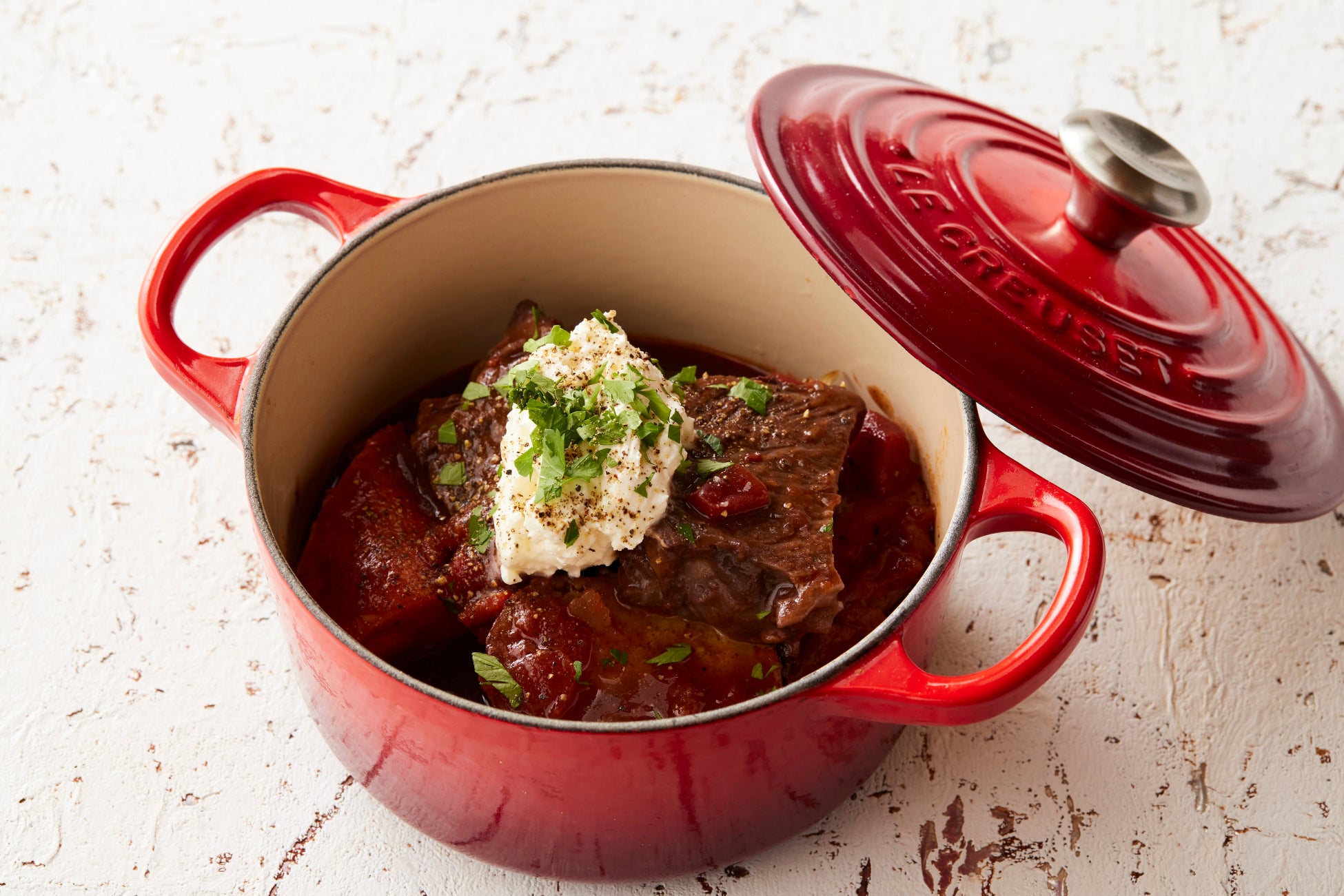 高い保温力により、ゆっくりじっくりと熱を加え素材の美味しさを最大限に引き出す、伝統製法のル・クルーゼの鋳物ホーロー鍋を特別に使用した、この冬だけのスペシャルコラボレーションメニュー。牛頬肉に白いんげん豆や金時豆、冬野菜とトマトを赤ワインや熟成黒酢で煮込みました。底のフムスやトップのマスカルポーネチーズと共にお召し上がりください。熱々なル・クルーゼのお鍋でご提供します。