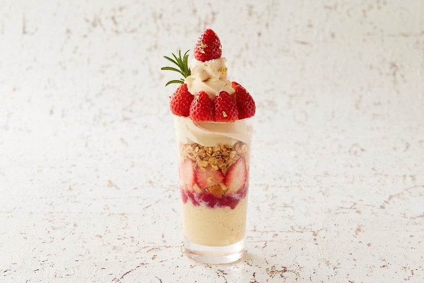 マダガスカル産バニラの有機豆乳寒天に旬のいちごやふんわり米粉スポンジに自家製ヴィーガンカスタードクリームと有機豆乳甘酒ソフトクリームを重ね、トップにはココナッツファインに華やかな金箔といちごを飾った4年連続登場の大人気ショートケーキ風ヴィーガンパフェ。乳・卵・小麦・白砂糖不使用で、更に今年は渋谷店限定のたっぷりいちご増量バージョンでご提供します。