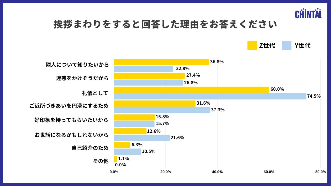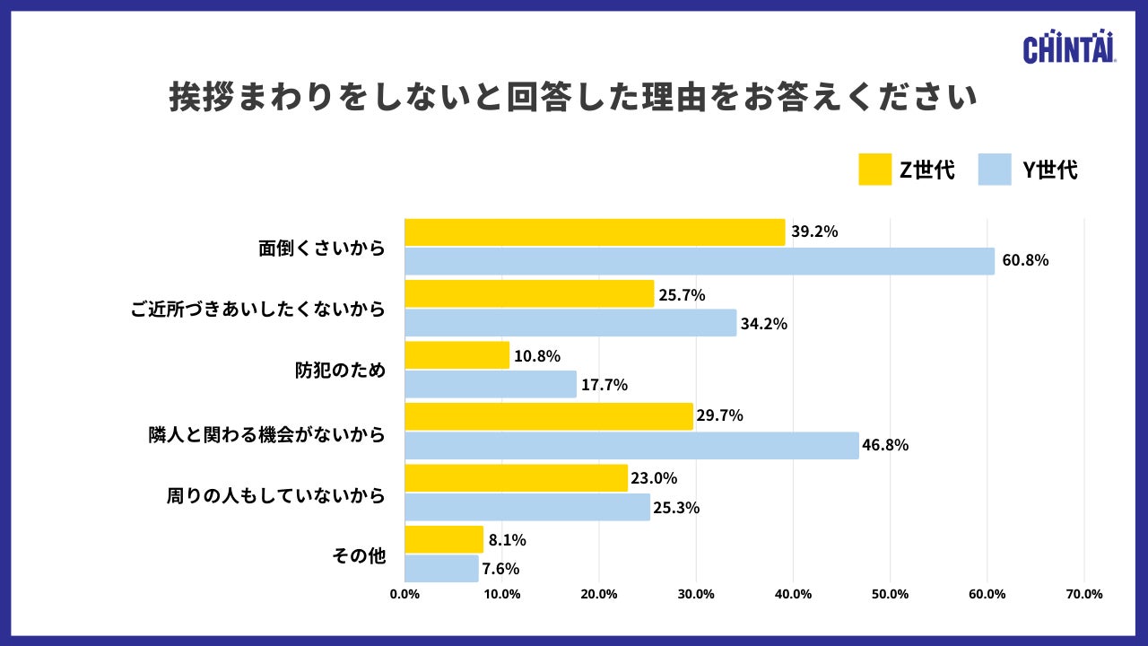 Z世代とY世代の両方が、「面倒くさいから」という理由で挨拶まわりを避ける傾向にあることが明らかになりました。また、「隣人と関わる機会がないから」の回答がどちらの世代でも2位となり、隣人との接点も減少傾向にあることがわかりました。