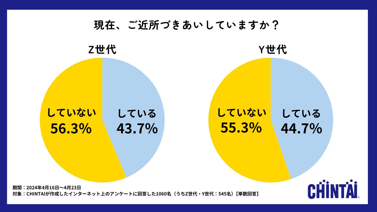 お部屋探しのリーディングカンパニー株式会社CHINTAI(本社:東京都港区 代表取締役社長 奥田倫也)は、2024年10月13日の「引越しの日」を前に、引越しの際の挨拶まわりとご近所づきあいの実態について2024年4月に実施したアンケート結果を発表いたします。