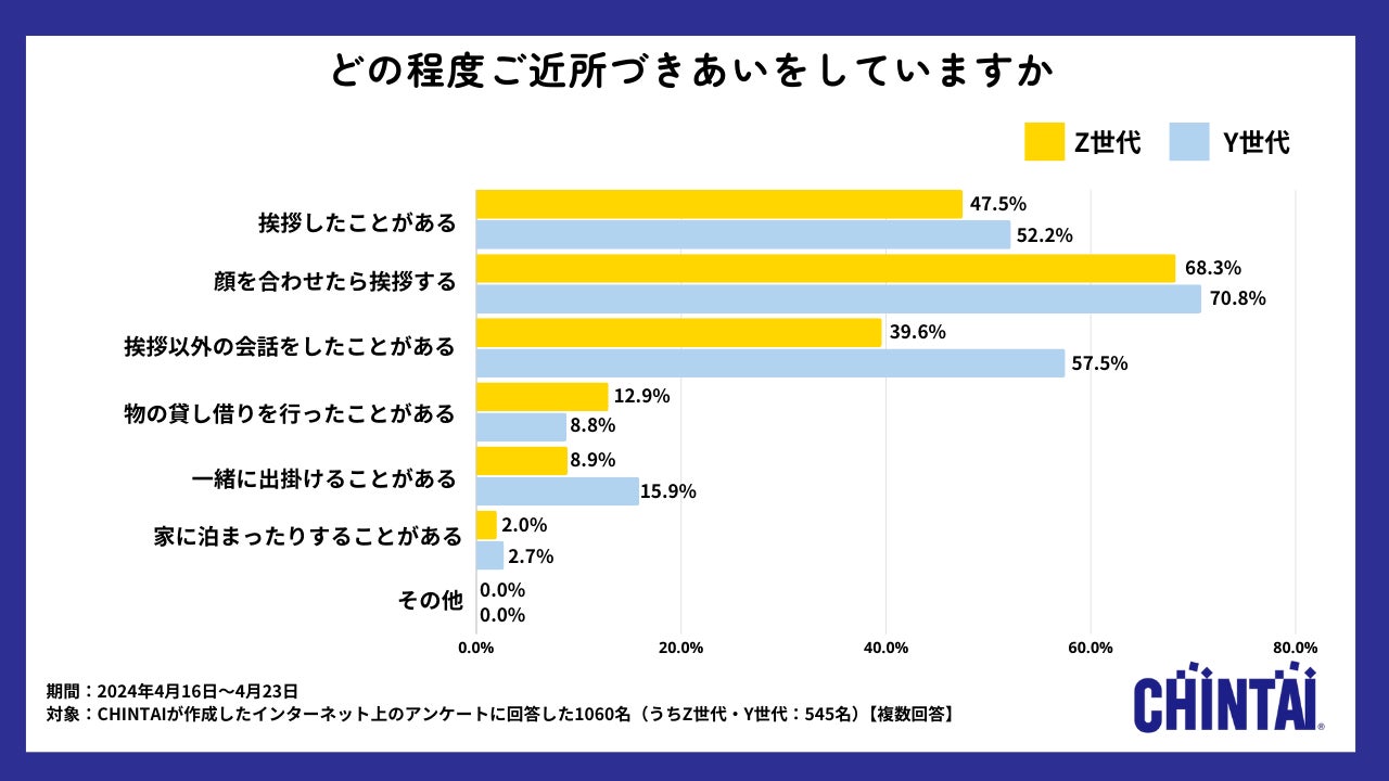 ご近所づきあいをしている割合は、Z世代が43.7%、Y世代が44.7%で、大差はありませんでした。ご近所づきあいの程度に関しては、Z世代は「顔を合わせたら挨拶する」が68.3%、「挨拶したことがある」が47.5%と、挨拶を交わす程度の交流が多い結果となりました。一方、Y世代では「挨拶以外の会話をしたことがある」が57.5%で、Z世代の39.6%を大きく上回っています。さらに「一緒に出掛けることがある」が15.9%と、Z世代の8.9%よりも高く、挨拶以外の交流も多いことがわかりました。