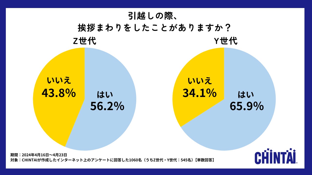 引越し経験者に「引越しの際、挨拶まわりをしたことがありますか」と聞いたところ、「はい」と回答した人がZ世代56.2%、Y世代65.9%という結果となりました。