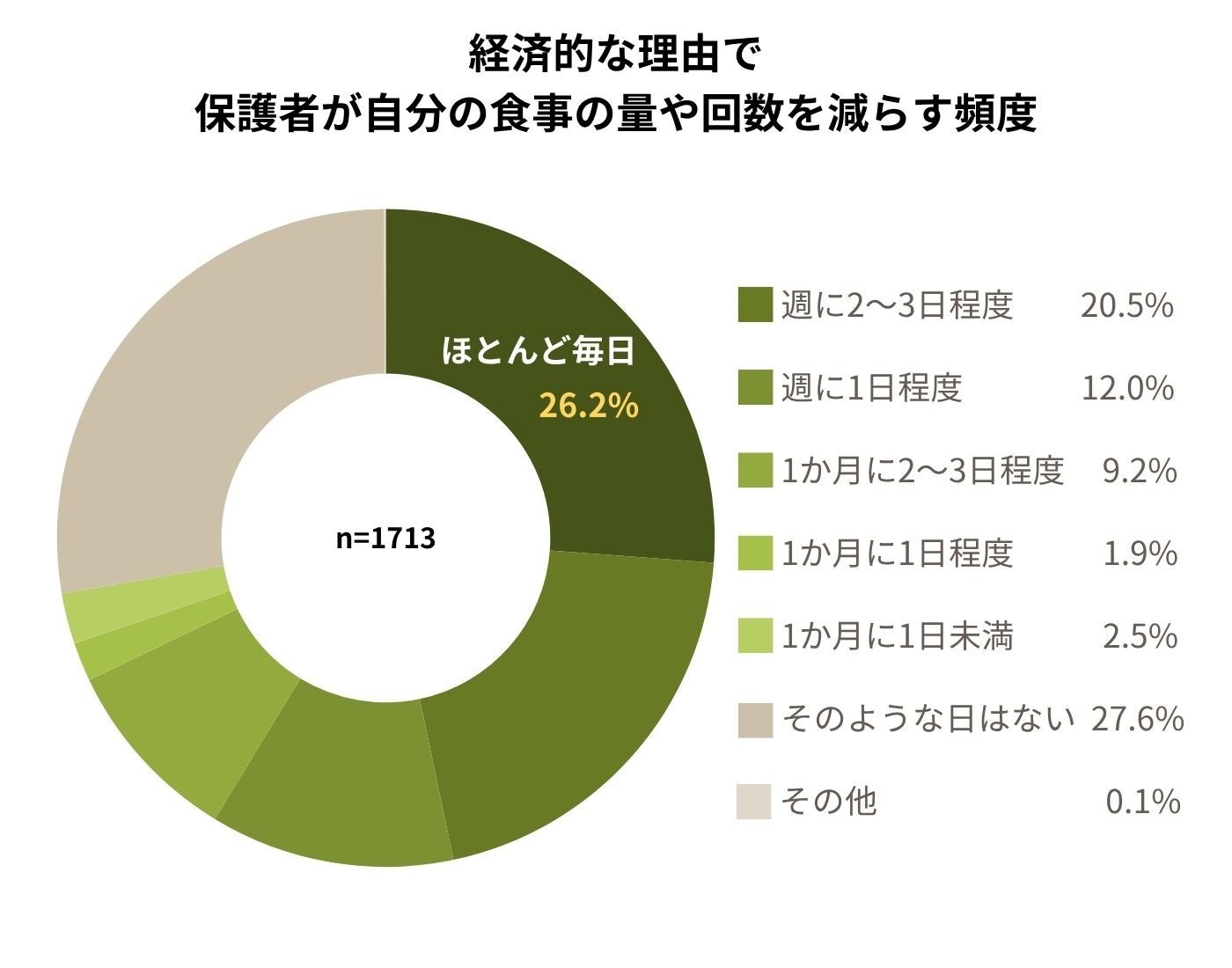 また、経済的な理由で保護者が自分の食事の量や回数を減らす頻度について質問した結果、食事を減らすことがある人のうち、「ほとんど毎日」との回答が最多を占めました。