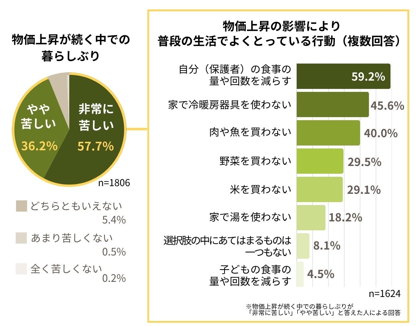 本調査で、物価上昇が続く中での暮らしぶりを質問したところ、「非常に苦しい」「やや苦しい」を合わせた割合が約9割にのぼりました。また、同質問で暮らしぶりが苦しいと回答した人に対し、物価上昇の影響により普段の生活でよくとっている行動を尋ねたところ、「自分(保護者)の食事の量や回数を減らす」が最も多く選択されました(複数回答)。