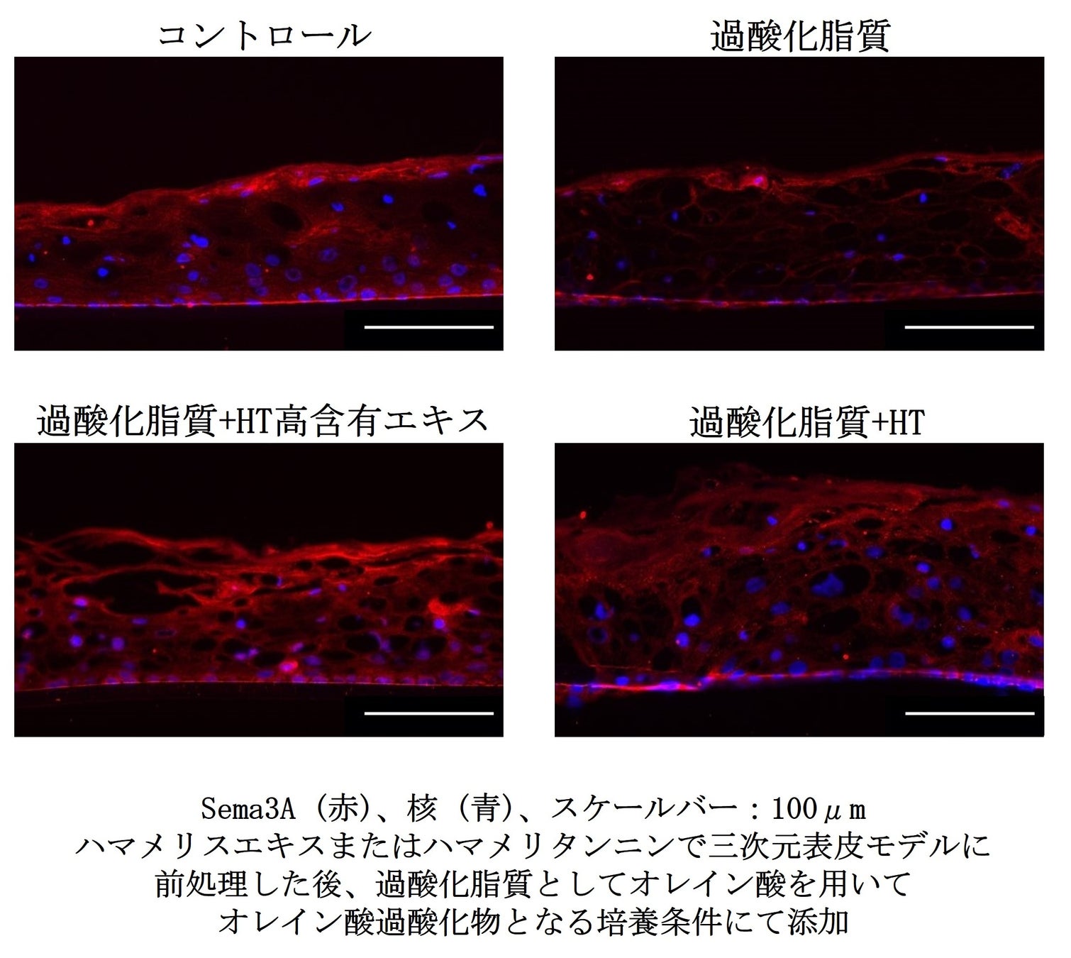 表皮角化細胞および三次元表皮モデルを用いて、HT高含有エキスを事前に添加した後、オレイン酸過酸化物(過酸化脂質として)を添加し、セマフォリン3A(Sema3A)の遺伝子発現量およびタンパク質量の変化を評価しました。