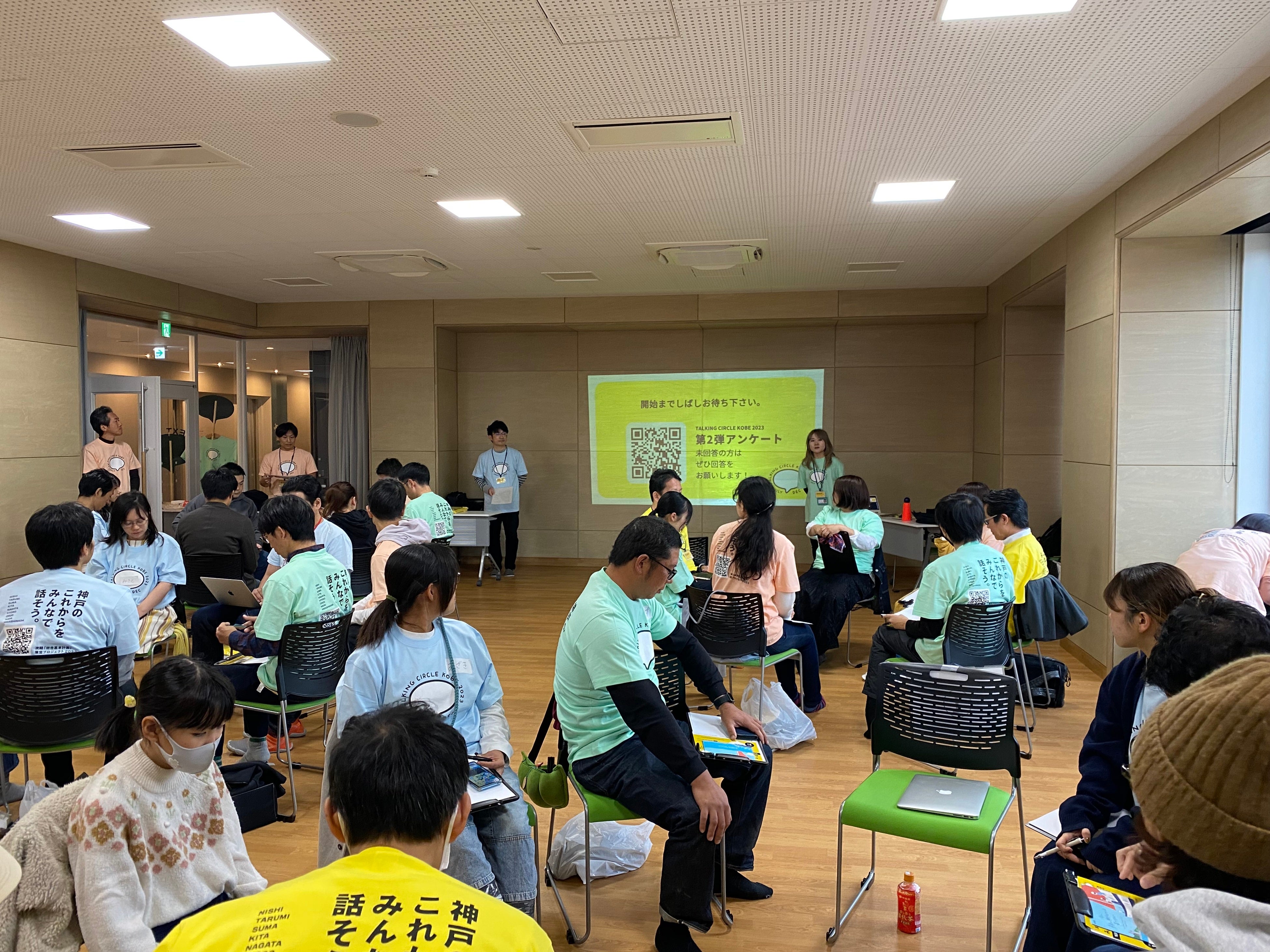 神戸市が今後進むべき方向性を示す「総合基本計画」を30数年ぶりに刷新するにあたって、そのベースとなる“まちの基本理念”ともいうべき「基本構想」づくりに向け、市民が思いを自由に語り合うワークショップ「TALKING CIRCLE KOBE(トーキングサークルコウベ)2023」が11月12日、神戸市垂水区に新しくできた神戸市立垂水体育館で開かれました。