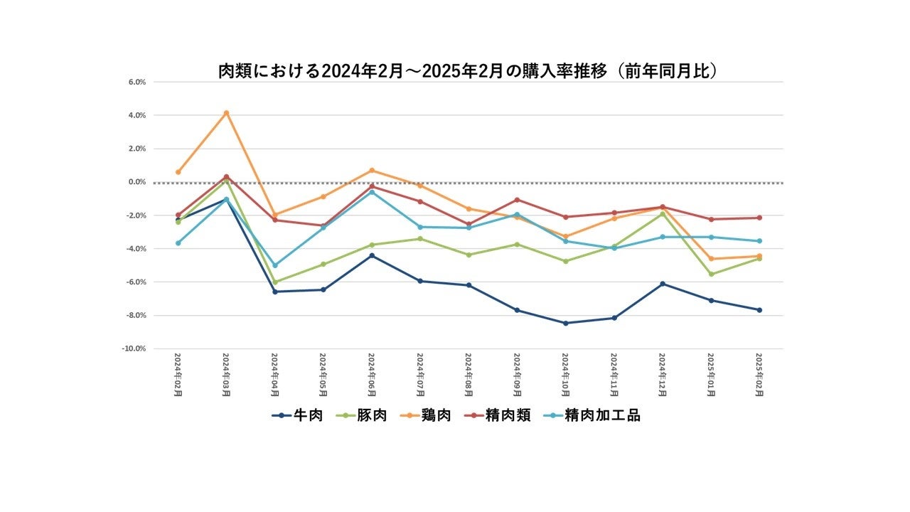 牛肉・豚肉・鶏肉・精肉類(羊肉、馬肉、ひき肉など)・精肉加工品(味付肉・ベーコン・ハム・ソーセージなど)の2024年2月から2025年2月における購入率(前年同月比)推移をみると、すべての肉類において減少傾向がみられました。なかでも牛肉は、2024年2月では精肉加工品や豚肉よりも高くなっていますが、2024年4月からは一番低くなっています。2025年2月をみると、精肉類、鶏肉、豚肉の購入率は前月よりも高くなっていますが、牛肉は前年同月比-7.7%と最も低い結果となっています。米、野菜、あらゆる食品の価格高騰が止まらない今、牛肉の購入を控えて支出を調整する節約志向が読み取れます。