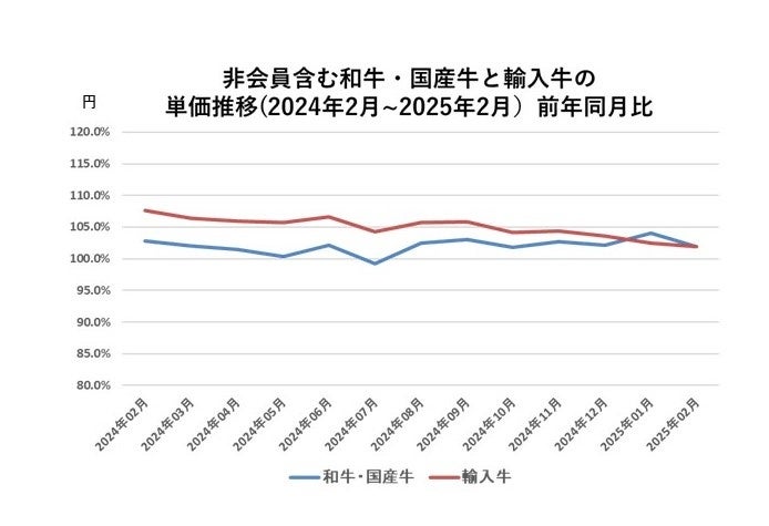 2)単価は、和牛・国産牛は安定的に推移。輸入牛は105%前後を推移。