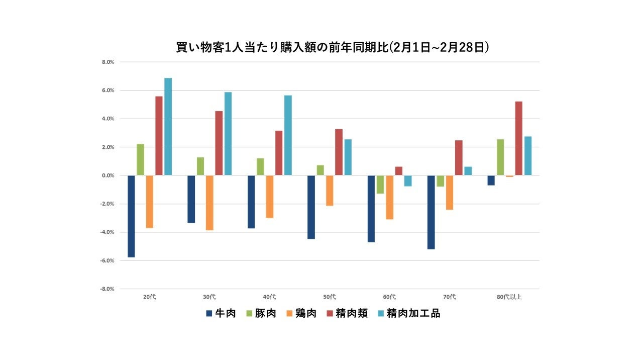 2025年2月の買い物客1人あたりの購入金額(前年同月比)を年代別でみると、20~50代、80代では豚肉・精肉類・精肉加工品の購入金額が増加しています。一方、牛肉・鶏肉の購入金額はどの年代においても減少していることがわかりました。購入金額では豚肉や精肉類、精肉加工品の購入金額の増加と牛肉や鶏肉の減少がみられ、購入率推移では牛肉の購入率低下がみられることから、食肉の購入品がシフトしている様子がうかがえます。