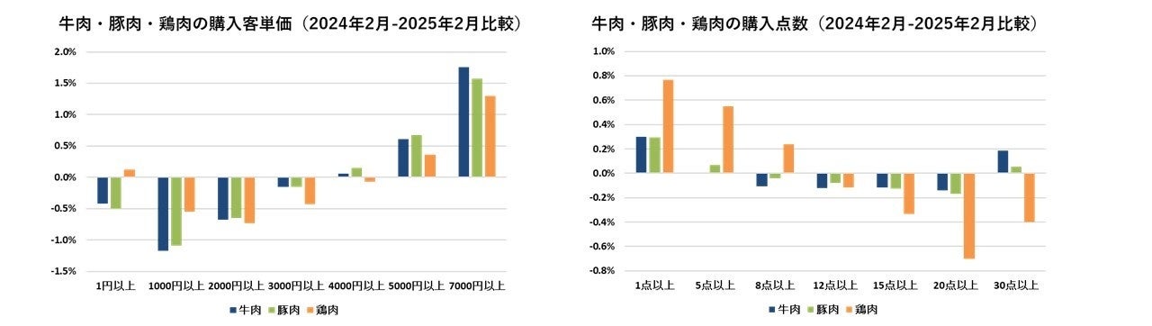 牛肉・豚肉・鶏肉の購入客単価および購入点数(2024年2月と2025年2月比較)をみると、購入客単価は増加していますが、購入点数が減っていることから商品単価が上がった影響がみられます。