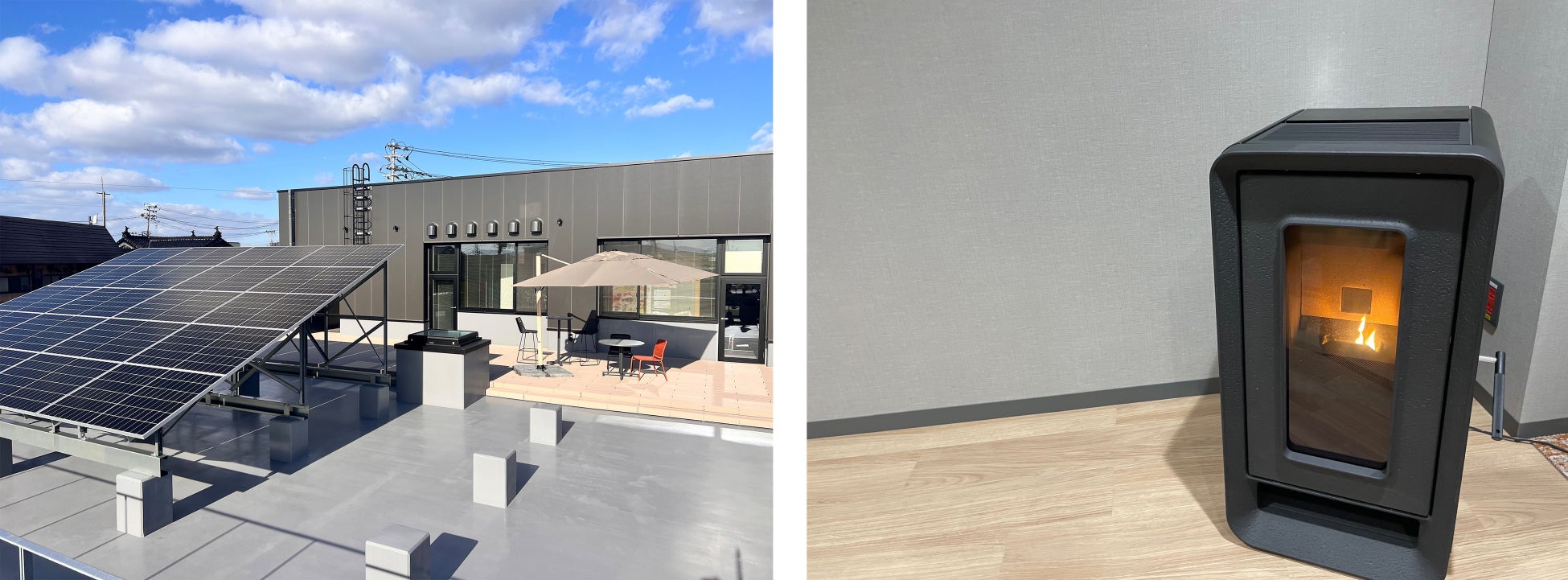 またペレットストーブは、間伐材やおがくずを燃料として使用しているため環境にやさしく、またBCP対策として有事の際、一次的に寒さをしのぐための暖房器具として導入しています。