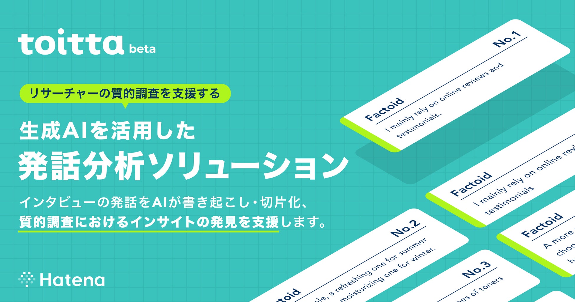 はてなが開発した「toitta」は、デザインリサーチやマーケティングリサーチなどのインタビュー結果の分析プロセスを支援する、生成AIを活用した発話分析ソリューションです。