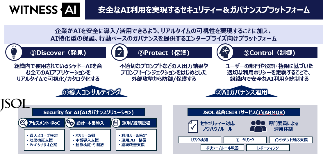 株式会社JSOL(以下、JSOL)は、AIガバナンス分野の先進的なソリューションを提供するWitnessAI, Inc.(本社:米国)とリセラー契約を締結しました。同社製品の「WitnessAI」は、生成AIやAIアプリケーション、AIエージェントの利用に伴うリスク管理および統制を支援するプラットフォームで、生成AIの利用普及や自立型AIエージェントの活動に伴って浮上している「プロンプトインジェクション」などの新たなリスクからユーザー企業を防御します。JSOLではさらに、自社オリジナルの統合CSIRTサービス「J’s ARMOR™」※1と連動することで、セキュリティー運用に関するノウハウを生かした包括的なAI統制を実現します。