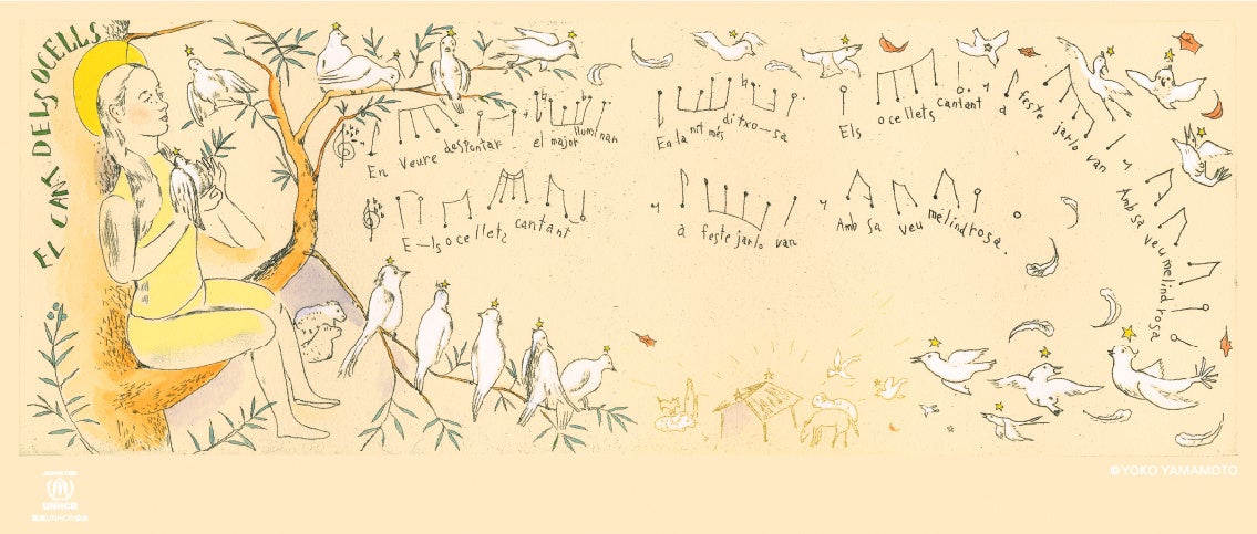今回『Think About a Refugee』キャンペーンカードに提供していただいた作品『鳥の歌』は、山本さんが1998年に発表した作品です。スペインのカタロニア地方出身の世界的チェリスト、パブロ・カザルスの『鳥の歌』をテーマに制作した作品。カザルスは平和への願いをこめてカタロニア民謡『鳥の歌』を生涯演奏し続けましたが、1971年10月24日、ニューヨーク国連本部で「私の生まれ故郷カタロニアの鳥は、ピース、ピース(平和)と鳴くのです」とスピーチで話し、『鳥の歌』を演奏したエピソードは広く知られています。