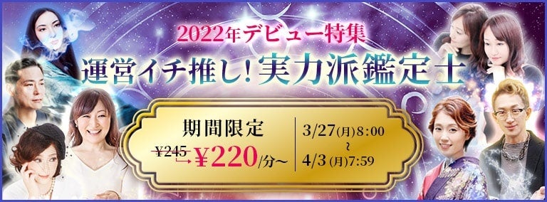 また、今回下記にご紹介する7名と、ほか3名の占い師の先生の鑑定を、期間限定でお得な価格で受けていただくことができます。特別価格で鑑定を受けられる期間は、3/27(月) 8:00~4/3(月) 7:59まで。ぜひあなたに合った占い師を探してみてください!