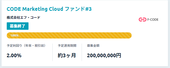 ・CODE Marketing Cloud ファンド#1…2022年8月2日に募集開始。即日満額申込。募集金額:5,000万円