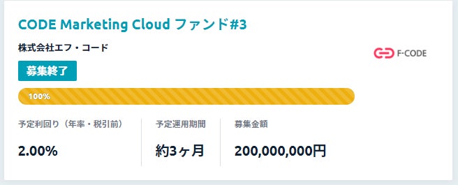 株式会社エフ・コード(本社:東京都新宿区、代表取締役社長:工藤 勉、証券コード:9211、以下「当社」)は、企業に資金を貸し出す形で投資ができる「Funds(ファンズ)」を通じて資金調達を行うこととし、2022 年 12月14日から「CODE Marketing Cloud ファンド#3」の募集が開始したところ、過去2回の募集に続き、今回も即日で 2億円の満額申込を達成いたしました。