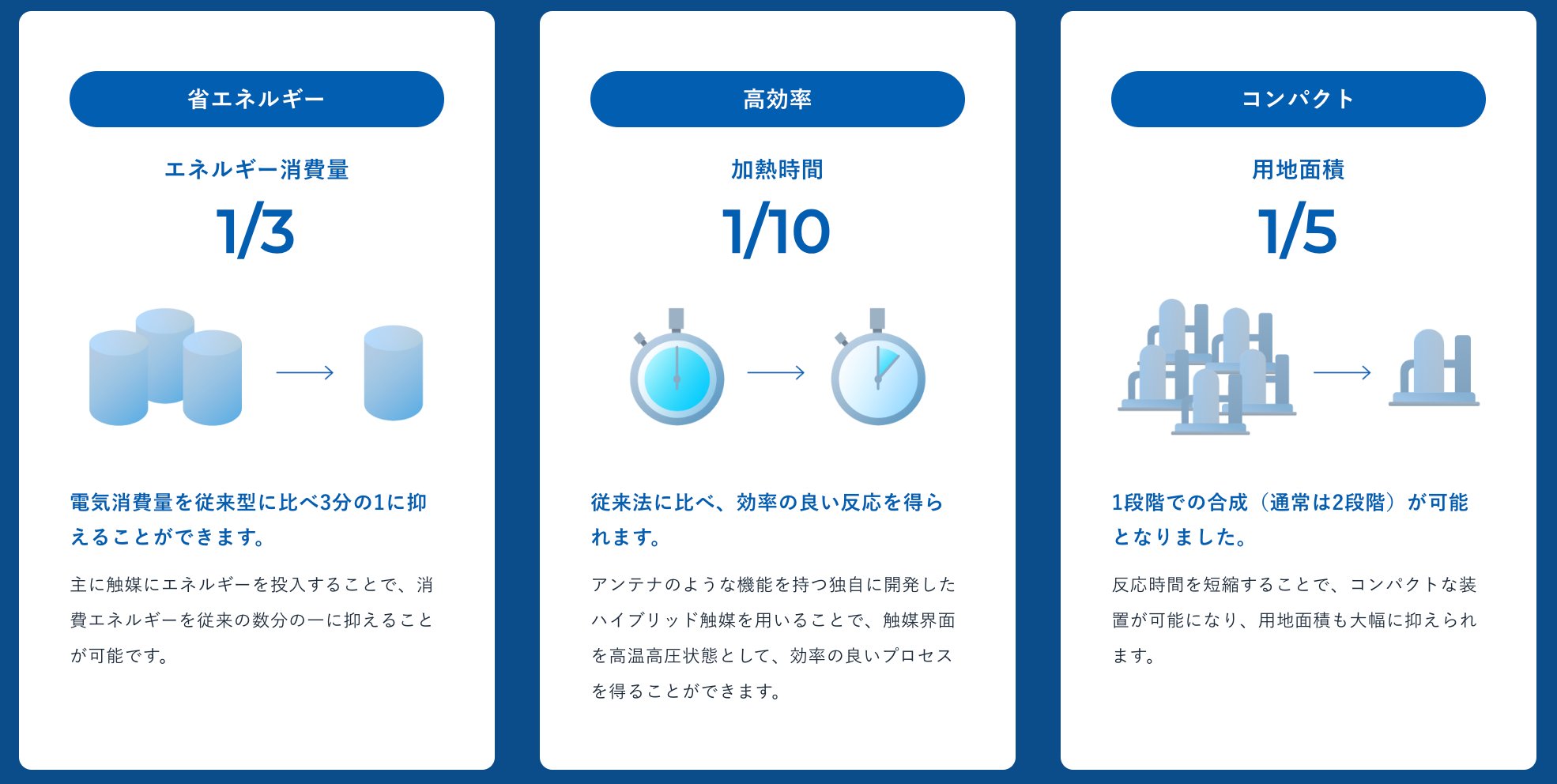 ターゲットである物質に直接エネルギーを加えることで、「省エネ」「高効率」「コンパクト」な製造プロセスを実現。再生可能エネルギーによる電化とマイクロ波プロセスを掛け合わせることで、従来法よりCO2排出量を90%削減することができる。