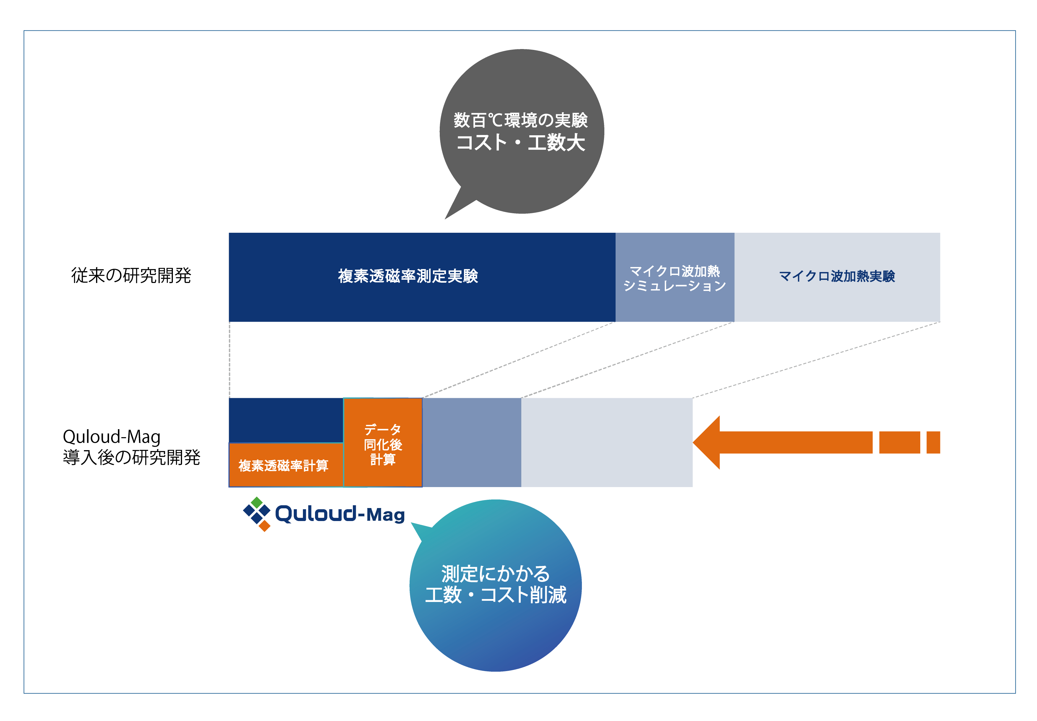 このため、本共同研究において、磁性材料の性質や磁気的挙動の予測を可能にするシミュレーションソフトウェアQuloud-Magとマイクロ波化学が保有するマイクロ波吸収能計測技術と組み合わせ、実験工数の削減、マイクロ波吸収能の予測精度の向上、予測範囲の拡大を目指します。