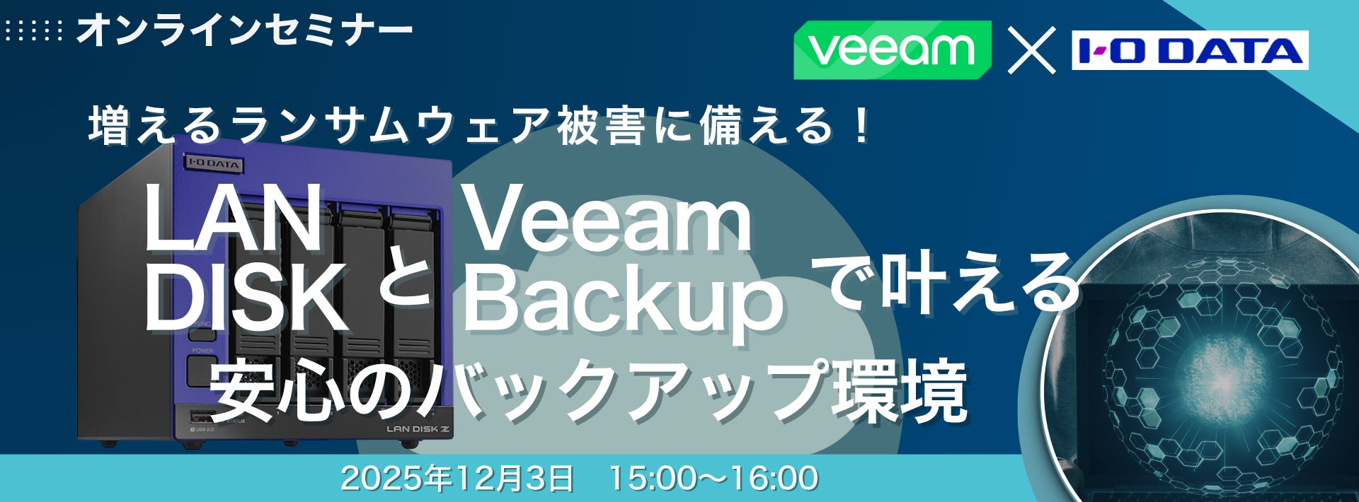 株式会社アイ・オー・データ機器(本社:石川県金沢市、代表取締役会長:細野 昭雄、以下、アイ・オー・データ)は、ヴィーム・ソフトウェア株式会社様との共同セミナー「増えるランサムウェア被害に備える!LAN DISK × Veeamで叶える“安心のバックアップ環境”」を開催します。