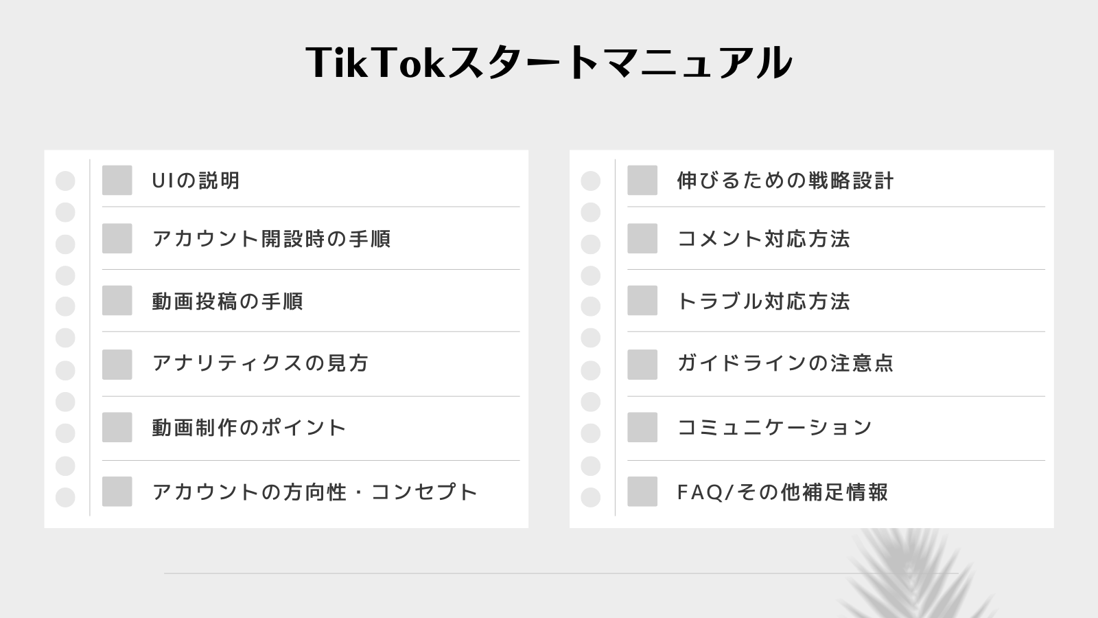 『TikTokスタートマニュアル』では、アカウント開設などの基本的な手順からコンセプトや戦略設計方法、動画制作のポイントに至るまでわかりやすく専門チームが解説していますので、入手後すぐ役立てていただけます。