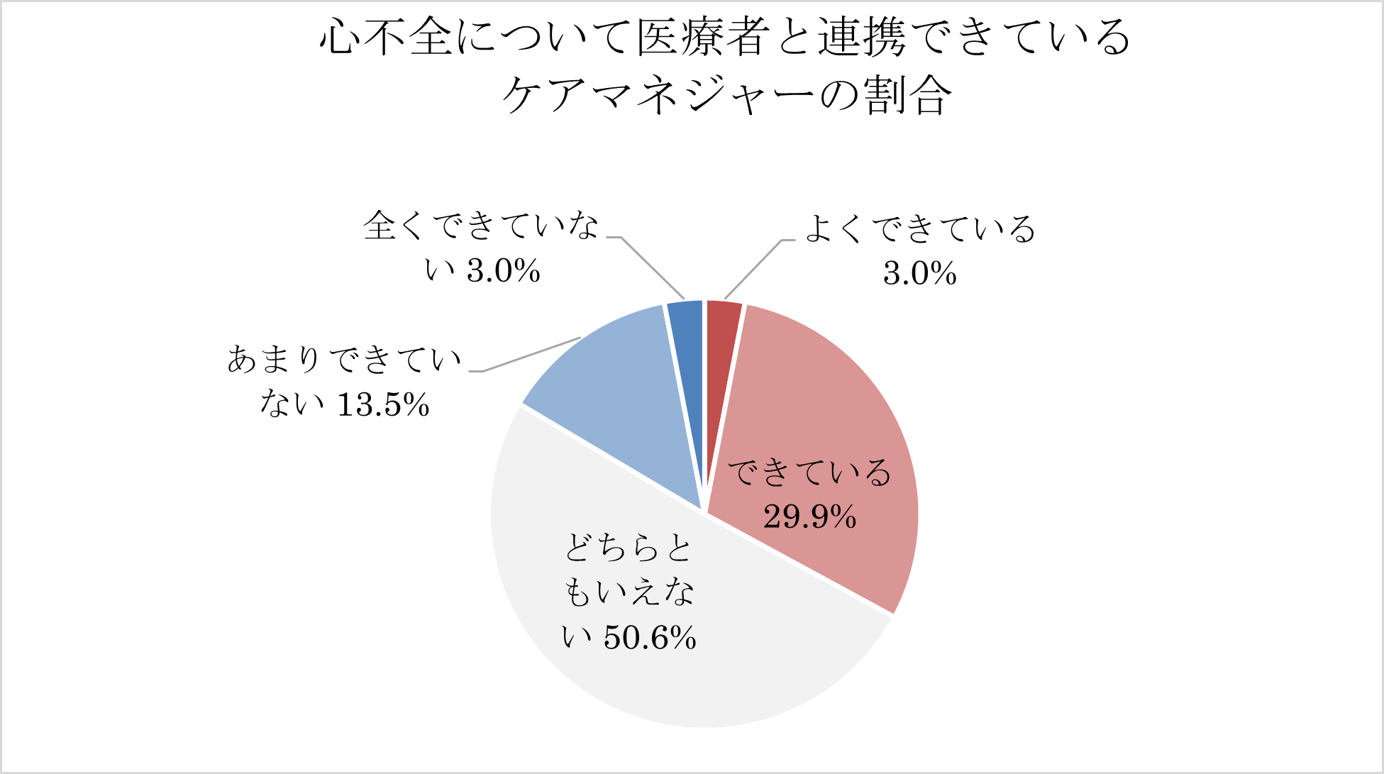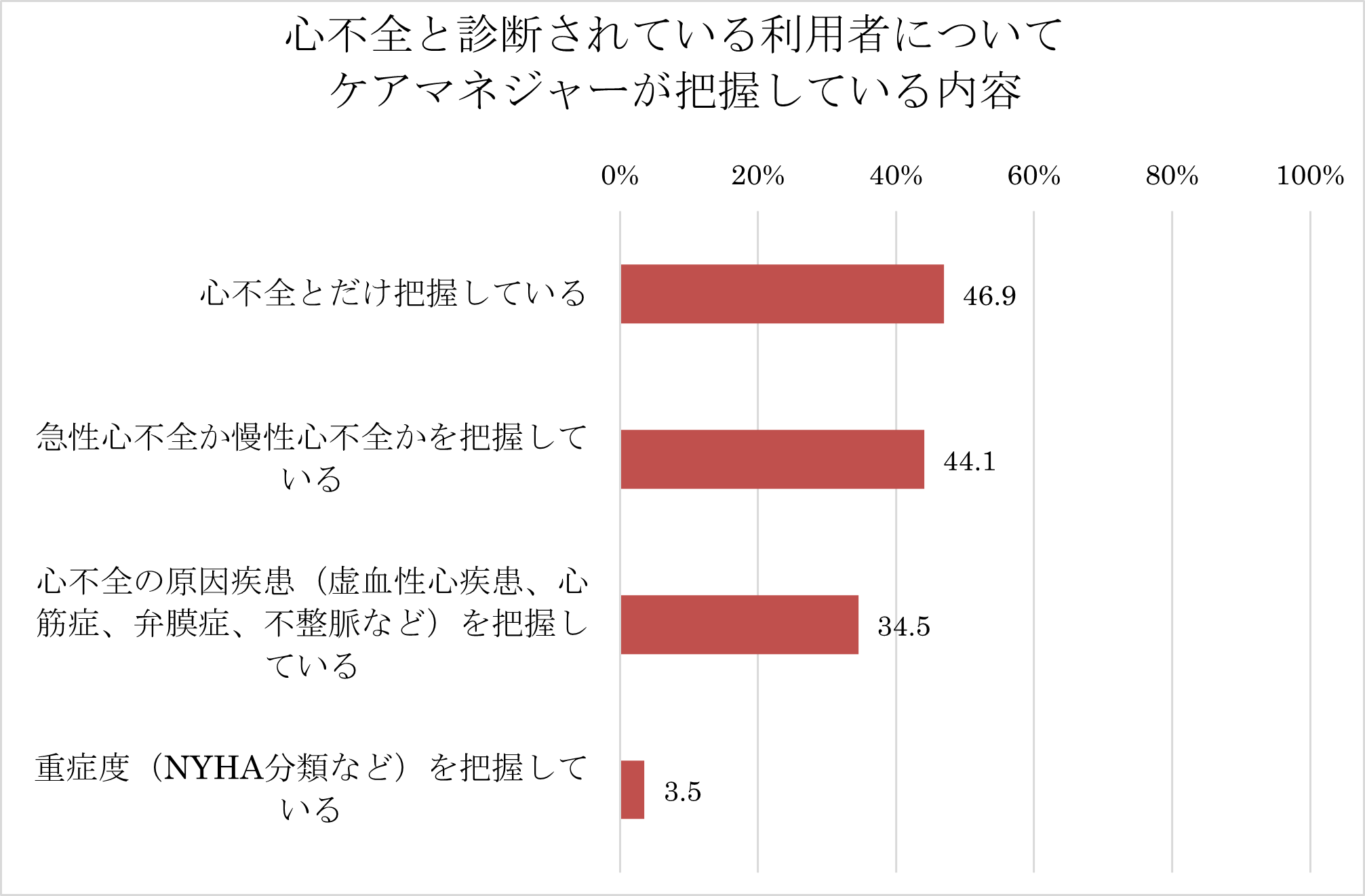 そこで、ケアマネジャーによる利用者の心不全の状況把握について見てみると、できているケアマネジャーは多くないことが分かりました。