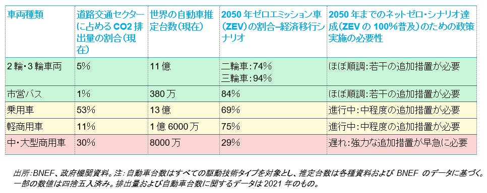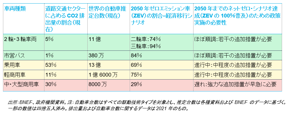 車両種類別に見ると、二輪・三輪車とバスについては、BNEFのネットゼロ・シナリオにおける目標達成に必要な軌道にすでにかなり近づいている。しかし、中型・大型商用車では大きく遅れを取っており、ネットゼロ目標達成には強力な政策措置がさらに必要とされる。経済移行シナリオでは、2050年までに導入されるゼロエミッションの中型・大型商用車は29%にすぎず、これはネットゼロの実現に必要な100%には遠く及ばない。各国政府は、トラックの燃費改善やCO2排出基準の厳格化に加え、政府機関や輸送会社などに対して中型・大型商用車の電動化に関する義務化を検討する必要があろう。また、複数の都市におけるゼロエミッション・ゾーンのほか、貨物輸送手段として大型トラックよりも電動化の実現が早い小型トラックへの移行を促進するためのインセンティブも検討すべきだ。