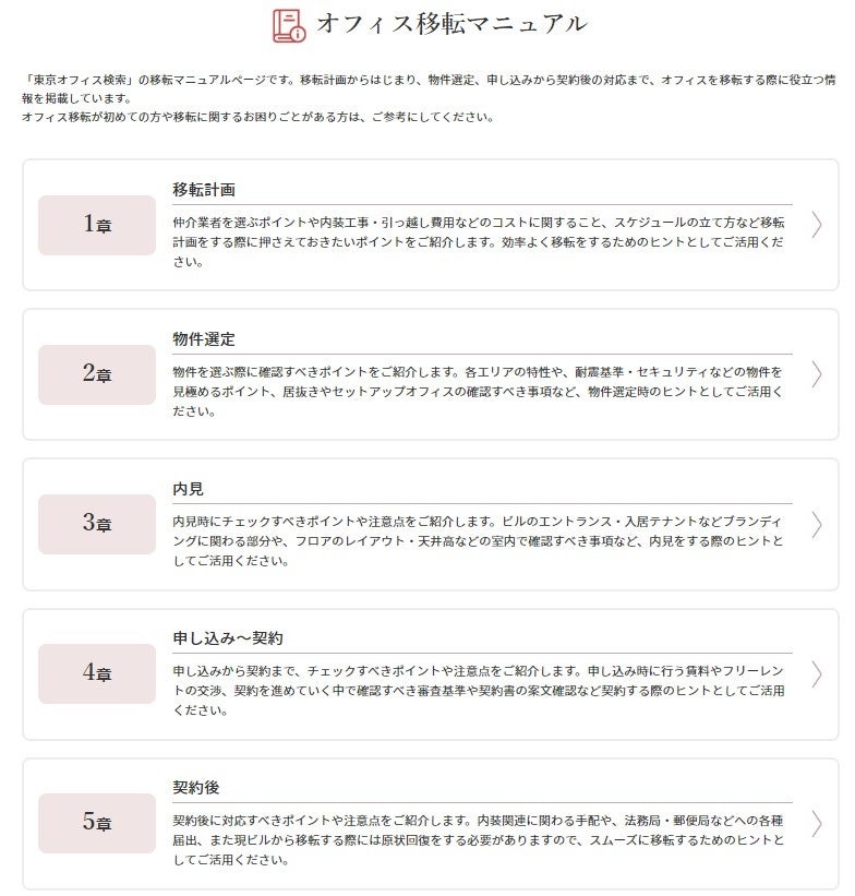 物件探しから契約までのノウハウやポイントをまとめているマニュアル集です。移転計画からはじまり、物件選定、申し込みから契約後の対応まで、オフィスを移転する際に役立つ情報を掲載しています。