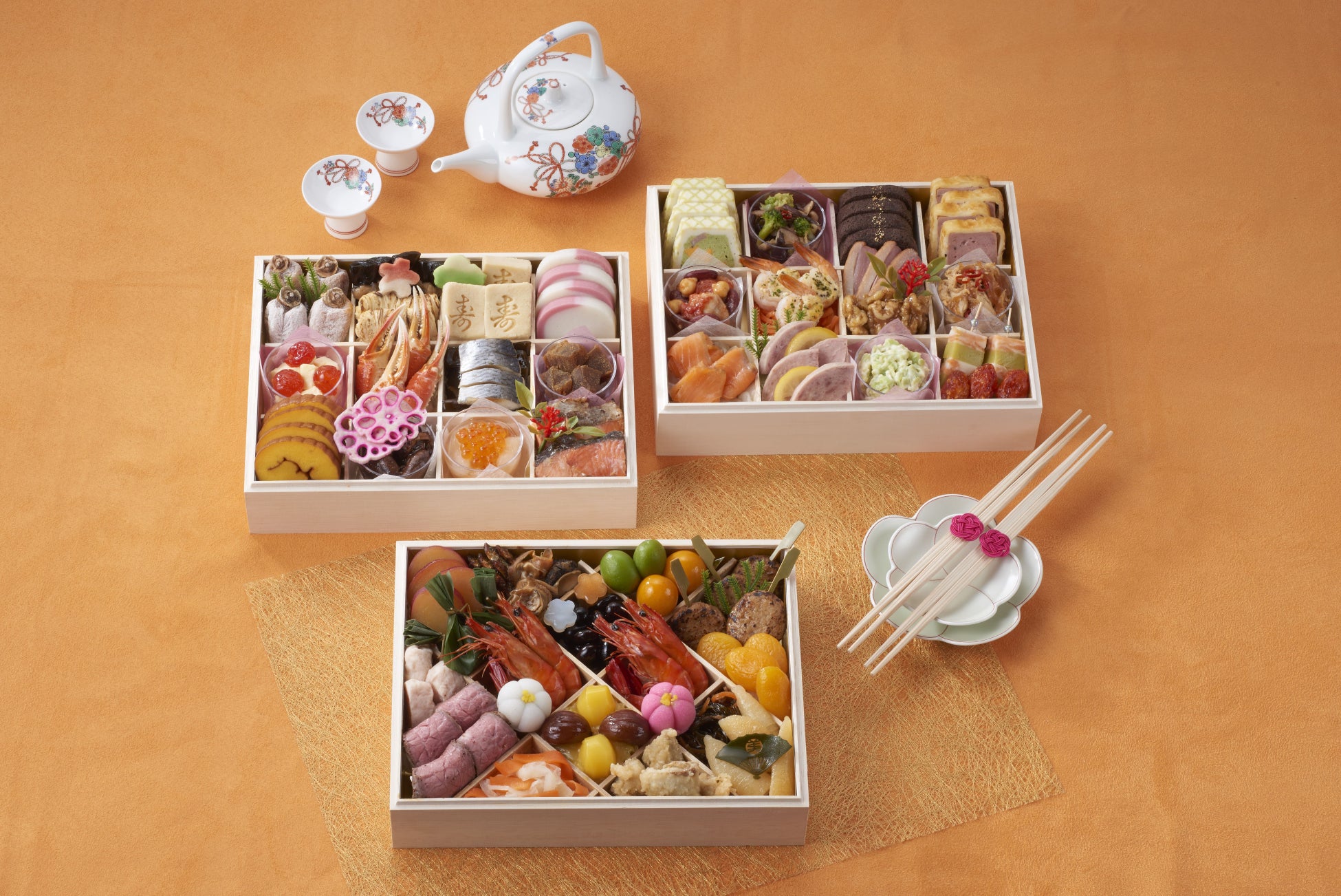 選び抜かれた肉・魚介類のほか、ビタミンや繊維質がとれる美容や健康を意識した”美的食材”を詰合せました。一部の具材にはすっきりとした甘さのオリゴ糖を使用するなど、調味料にもこだわり上品な味わいに仕上げました。伝統的な和のおせち食材は押さえつつ、洋・中のほか伊・仏風の味付けまで。また、前菜・メイン・デザートまで揃いコース料理のように楽しめるラインアップです。