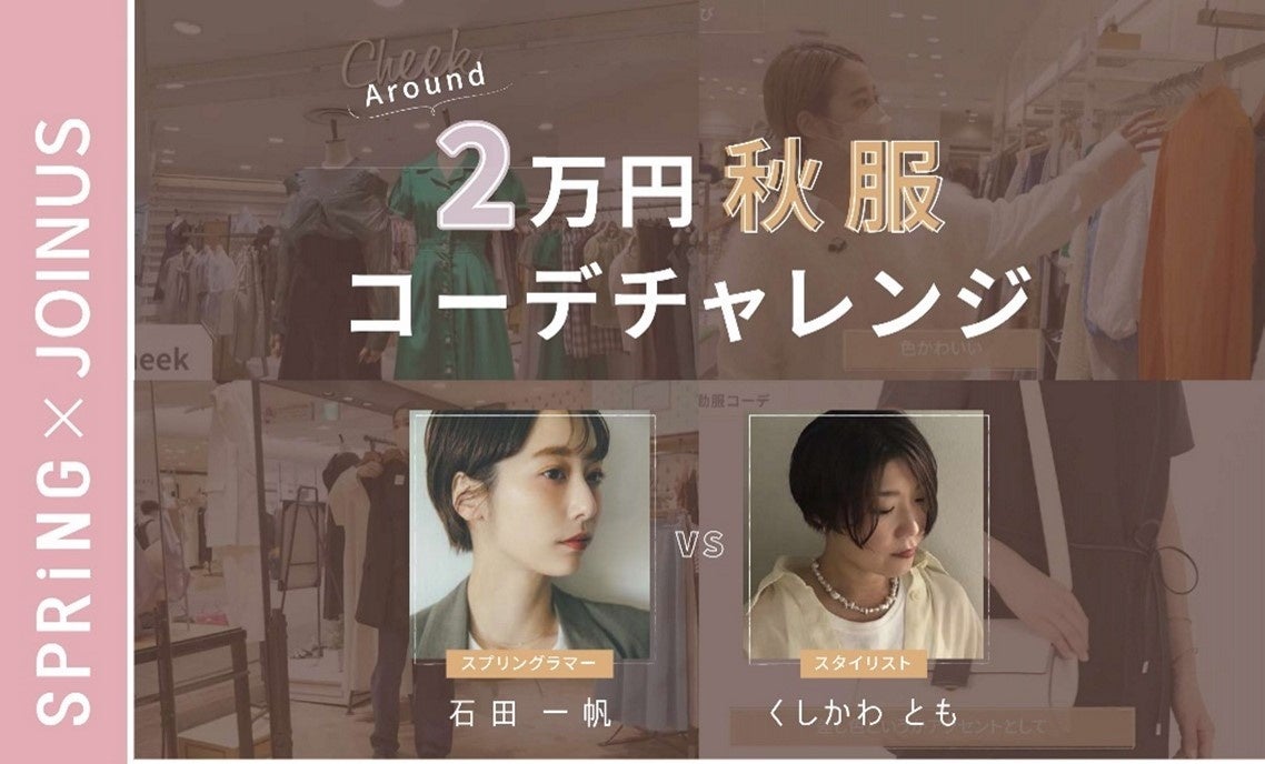2022年9月8日(木)よりSPRiNG公式インフルエンサーであるスプリングラマー石田一帆さん、そしてSPRiNGをはじめとする女性ファッション誌で活躍しているスタイリスト くしかわともさんによる、コーディネート対決動画「SPRiNG×JOINUS 2万円秋服コーデチャレンジ」をSPRiNG 公式YouTubeチャンネルにて公開いたします。動画ではジョイナスにて、2万円前後で揃う秋服コーデを合計4コーデ紹介!また、ジョイナス館内でも、お二人がセレクトした最新秋服コーデを紹介します。