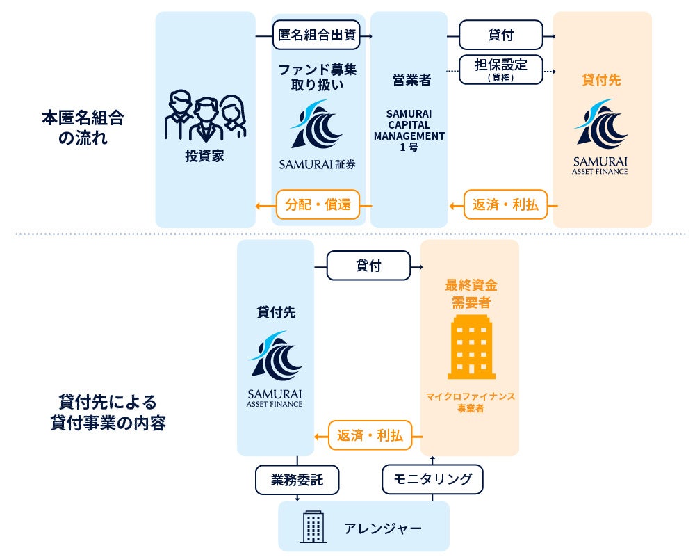 このファンドは、SAMURAI CAPITAL MANAGEMENT1号合同会社(以下、「営業者」といいます。)がSAMURAI ASSET FINANCE株式会社(以下、「貸付先」といいます。)に対して貸付(以下、「本件貸付」といいます。)を行う貸付型クラウドファンディングとなります。