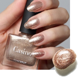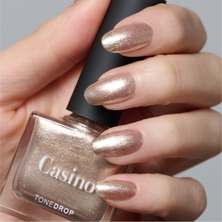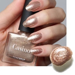 ポイントは、ネイルと指先に一体感が生まれるような「TONE DROP(トーンドロップ)」 ならではの肌映りの美しさ。みずみずしく透明感のあるカラーに少しのくすみを加え、プレイフルなのに柔らかいニュアンスのリゾートカラーを実現しました。大粒のラメと繊細なパールが織りなす輝きは、軽やかでインパクトのある美しい仕上がり。肌に自然に溶け込み、どんなシーンにもマッチします。
